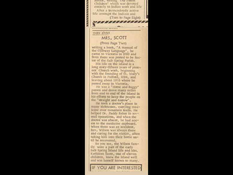 what time is it now? 20 past Yes, I show very quickly. What he told him, his own family what's in the journal is that he was exhausted. He just was too tired. And he had, he just had to stop. He had to give up. His doctors told him that he was having that he would die if he didn't stop. And actually, that got told to him quite often, because he was an overachiever. These spindly little guy put out a lot of energy. But I think that he suffered from too deep depression, a kind of inner shock, that he could not change, what could not be changed. And he did not live happily ever after with. And my heart goes out to them. And I feel so much now that if there is anybody today, who is crying out and trying to write stuff and trying to change some tide that is starting, or that has already taken hold in the world, please write it all down, keep it in some archive somewhere, at least in what is it that more than 100 years time somebody will know that somebody knew better than the people who were stopping that person from doing what they knew what's better, after all. So that's why I'm standing up here. I'm defending Reverend Wilson, against his depression and I think he brought here to Salt Spring and why he was such a crotchety old fella. He was called a stormy petrol by the Hamilton. I love that. And the things that he said, I'd go even further than what First Nations say now today. He said they needed a government of their own. He said they needed a Governor General of their own. He said they needed in the land, the property that would be their kingdom of their own but not a king land there. He just went way, way further than they're asking for right now. And he just put it in such interesting ways. When you go out on his speaking tours. He would say things like, when we first came to Canada, the Indians looked at all these Europeans and thought they were all one race. They saw white skin and they saw oak kinds of different colored hair, that they are different from us. And they all had white skin. So they and they were all uttering what sounded like gibberish. So they thought it was all one language, and that they were all one race. That was not. So they learned that slowly as they lived amongst them, they detected that they were Germans and Spanish and Italians, and French, and so on and so forth in Britain. And he said, Well, maybe we should look a little closer at what we assume that Indians in Canada are all the same. So he, of course, by having traveled so far, knew that they were all incredibly different kinds of cultures, kinds of people, kinds of ways of making living kinds of ways of, of socializing, and believing in things. And he, that's why he was doing all the studies that he did, and wrote all the stuff he did. As well as that he felt he said, We should listen to the Indians. And above all, he has already listened to the Indians, and he knows they do not want to lose their language, they absolutely must not lose their language. And that is the most key thing that I see in the destruction of a culture is when you take away a person's language, you take away the way they think, the way they envision things, the way they understand deeply within each other. Everything is in your language. And so I hope that as many of the First Nations as possibly can, can regenerate their language so they can know who they are, because otherwise they're all speaking English as a foreign language. And it's a very different culture. And Reverend Wilson has all these wonderful ways of showing you how you would wish that you were one of them too. You would wish you were a job. Well, you would wish you were Cree or you wouldn't you rights quite a bit like that too, because they are so much finer than the civilization he brought with him. They are gentler, they are kinda they are more accepting. They are not as mad they don't hurry and bustle and rush so much. They have no words for for all the things that Reverend Wilson didn't like, like people swearing and stuff like that. They hold their land in common that they share is they care about each other. So many things that he did that I can't tell you about because time's up. You need some tea and cookies. So Reverend Wilson