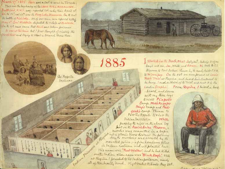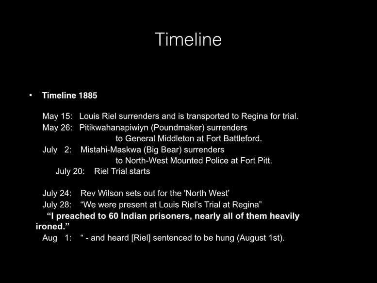 There are three there's a sequence of three in the middle row. And on the left, it is what Mother Wilson hears something in the night. She's in a tent, right? She sits up. This is what she thought it was. Okay, lions and tigers and bears and snakes. This is what her husband thinks it was a little squirrel. Okay. There are many, many cartoons. Here's a cartoonist par excellence for his children. There are pages and pages of this in his journals. Okay. And what else have I got? Yes. So now 1885 comes along and he has his midlife crisis, or we're going to have a midlife crisis. Okay. So he's 14 years old now. And he has a midlife crisis. This knowledge that he is part of something that is bad, is getting him to weigh him down. He starts having what I would call depression, what they call neurasthenia. And he has breakdown, nervous breakdowns and all sorts of things. And he suffers from exhaustion. I'm not surprised he suffers from exhaustion. He works a mile a minute, all the time. And he writes and right, and drawers and drawers and organizes and organizes and fundraisers and fundraisers always with no money left at all. But he manages to get fundraising in just in time to those starving because people weren't giving him any money. And they're all there's lots of things like that, that all kids are working there. They're looking after themselves. He's bringing them up so that they will be able to look after others as well as themselves. But you will hear that residential schools treated them as slaves because they made them work while they didn't have any money to pay for any servants at all. And he came from a segmented family that had servants to do absolutely everything, no rich and wealthy family that made their money in the silk trade. I think that there's another part to Reverend Wilson's part of it. But I also know it's expedient to have no servants because you don't get very much cash, especially as a church run school and specially as a government funded school. It's not they don't do the job that they say that they're doing. Okay, so when he first started the school itself, the Shamrock school. This is what he wrote at the time in 1873. That he said, so the kindness of friends in England and Canada, we got lots and lots of money because of the fire because the first one was completely destroyed. We the institution a new institution is in process of building at Susannah Murray, about nine miles from the old site upon the beautifully wooded banks of the river Samory. Here the children may ramble, hunt, fish and paddle with the Liberty so essential to Prairie born Indians, and the denial of which would probably result in their leaving the home. The parents whose children were members of the original institution, are willing to send them again and also willing that the new school should be at a greater distance from their old homes is very grateful for that. Reverend Wilson is repeatedly extremely grateful to the Indians. He understands what what a lot they're putting up from him. Oh, that's the fire brigade story. Oh, that's fine. I won't tell right now by this page. Not sucking. Right. Oh, we've got more funny stories carry on. Oh, yes. No. Well, yes, I'll say we we have a high time with the white spiders down at the bottom here. And my daughter tells me I've got to do something about the ants. Next slide. At the top now football too late, you missed it, but it's they sent him out to buy a chicken so he goes out and buys a chicken and of course it's alive. This is when he's traveling. They go on 7000 mile journeys. So my wife and daughters do not know how to prepare chicken. That is life they do not know how to kill it off target. So there he is doing it himself. Okay. Finding out probably itself. Okay, next one, Frank. Oh, we haven't got the hate. Nevermind. That's okay. There's another cartoon out. There's the Hey, all right, this is him. All right, so he's got his own relatives come to stay at younger one and an older one. The younger one is a touchy one in each case that John's team runs away, top left hand side, Lee pursues if you can just see him there. So they've got away with this and it is not an experienced farmer. Reverend Wilson is laughing and absolutely sure he is wildly sketching this. He's laughing and laughing laughing. So number two, they rush madly into the barn. John will assuredly be swept to destruction. Lee weeps. Number three down here pulling for you, John. You see what John did actually have a bright spark in him at the last minute. But Lee still weeps. And then what happens? They didn't actually want to be in the barn after all, so they come back out again. All's well that ends well. Lee gives way to an exploitive. Crikey. Okay. Modern term, I thought. Okay, so now. Next is at 85. All right, what was the catalyst for his midlife crisis, apart from the fact that he's getting depressed and stuff. There are some very heart wrenching letters that he wrote to his father about the state of his mind and the state of his beliefs and things like that, because then he's also very exhausted from trying to raise funds all the time, and very, very angry and frustrated, quite angry, apoplectic, probably about governments and things like that political obstruction to his his visionary goals. And in 1885, he was traveling anyway, probably volunteered, but was the chaplain for the Louis Riel trials, he actually went to, to, to the Riyadh the Red River rebellion much, much earlier when he was a younger man. And at that time, he thought that they were all bad naughty, because they were committing treason against the queen. When he went to this one, he also started out by thinking that he was that they were Wilson didn't display any doubt which side he favored to win. He asserted that rial had raised the flag of rebellion, and that happily, we have the Canadian Pacific Railway in a fair way towards completion, the better so to get Canadian troops to the scene of the action t
