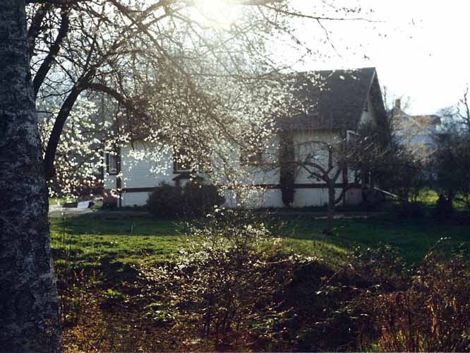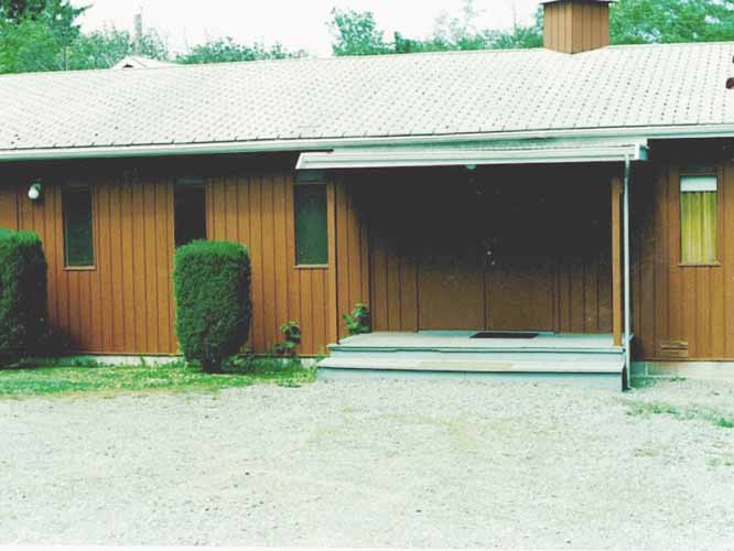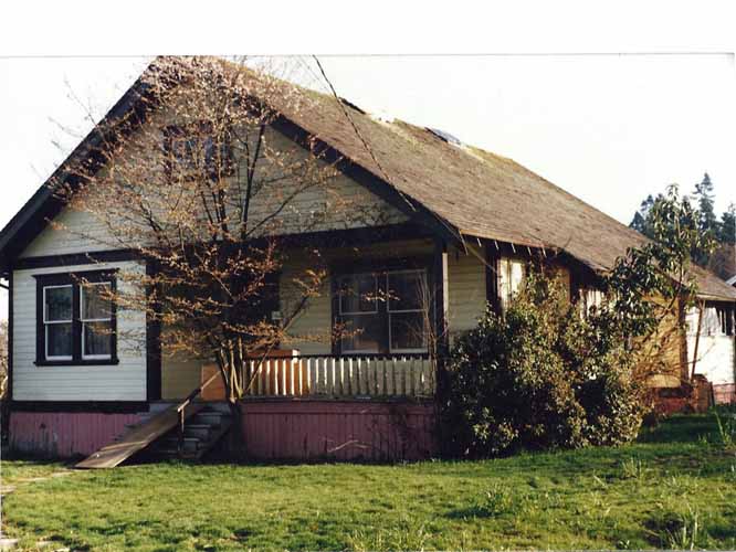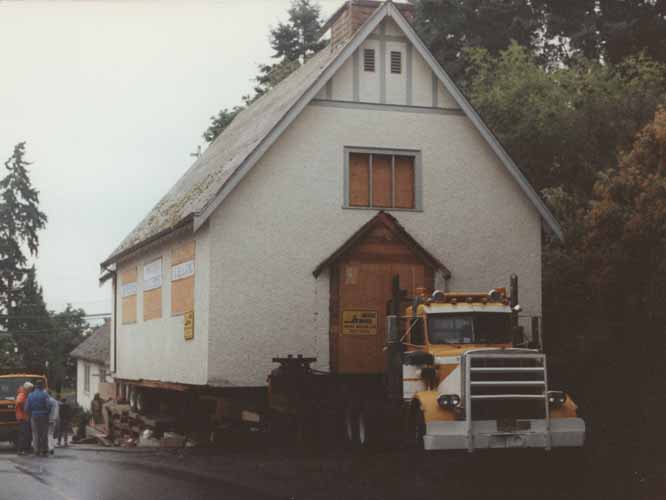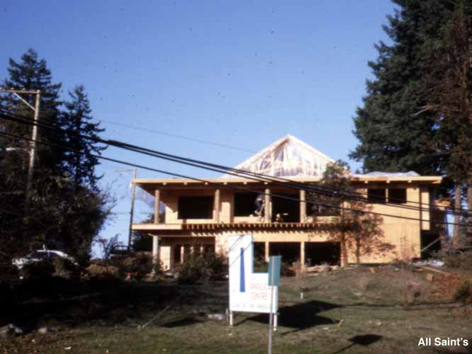 The offer from the Legion was accepted and the construction on on our existing church was started and we built a this structure it to me it looks like it's got asbestos siding on it. I'm not sure about that but hundreds of homes in British Columbia have asbestos siding nobody knows that but there's is there. All of the wartime houses have asbestos siding. The building was completed on October 24 1952. And then in 1960 it was decided that the old Manse was no longer suitable and shouldn't be sold. This is the sprint back this is the original entrance into our building it's the west side by the parking lot if you wonder why I'm confused I have two pictures on the screen and I'm really not too sure sometimes. It's like you got to picture that you're what you're looking at so the buyers house this is a family that lived on Hereford was up for sale and the House and the two lots adjacent the church property and to the west was purchased. So we now have 460 foot lots 240 feet of Hereford which we have today. The bass was vacated in 1974. And in 1985, the building had deteriorated to the point where it was of no value to us anymore. And it was sold for $500 and then move to another site. I'm not sure but looking at some of Frank's pictures the other day. I have a feeling it became the barber shop on Nick Phillips, the building that was torn down for the library site. I have to go to the archives and look at that one again. But I'm pretty sure sure that that's the building over the years of Sigmar Harishon over the years a changes have been made to our existing church in 1983 84 a new entry. As I showed you, the entry was on the east side, a new entry via the West ports was constructed. The original entry was on the side where the library is now situated. The church was shingled and stained Brown, and then a tea in 1986. The outsides theory was enclosed, the new washrooms added in 1994 it was painted black and white. You may remember that and in our one, it was painted black and white. Our Celtic cross was also added. You'd see it there in the picture, and