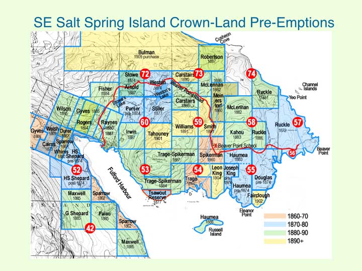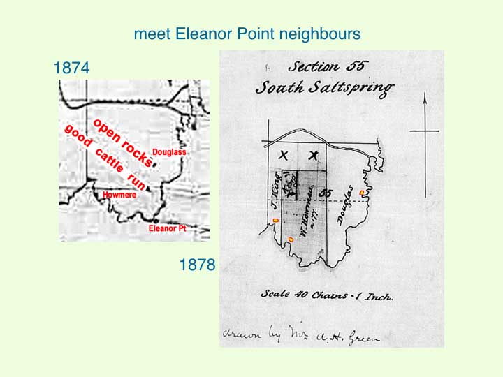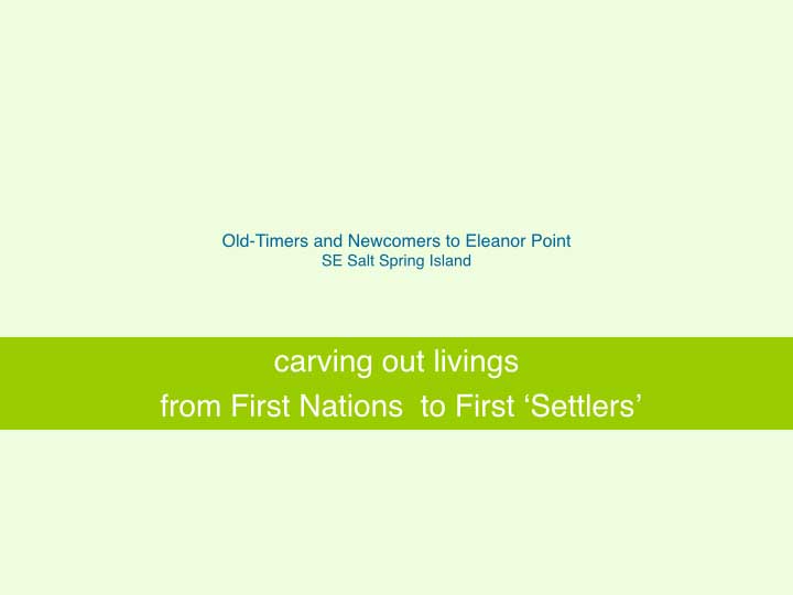 Now, we're going to get going on this pretty quick. We're going to time travel here. And we're going to time travel pretty fast, pretty tight presentation, as Julian says, I pack a lot in. I did want to start, however, since I seem to have come out of the blue, and why am I writing history now? Well, my first history books that I wrote. And I just dropped them to wave them, because it'll be the quickest way to do it is a biography of Captain Vancouver that Marlon horse stole, published in 1992 on stormy seas, and I did 10 years of research before I started to write. So that's where I really cut my teeth on how you do the research and do the writing. Ask me anything about the late 18th century world, I got up to speed on it. The next thing that I did, because I teach karate, is I've written a book, about a third of which is the history of the karate away from Okinawa. So that one, and I've been busy doing family history, this is the first of two books. So this is why I got into the format that my, my new book is, so I'm doing these as book form just just for family, obviously. So I've been immersed in that sort of family history telling, which is what a good deal of this is. And then as Jillian has says, We have ruffles World History of southeast Saltspring Island, and it was the monk farmhouse that got me going. So let's get buzzing along on this talk. Because here we are in the Deep South, and we're going to hell on a point right here. And I live in this neighborhood Harry Burton as some of the others of you do. So impacts of old timers and newcomers on to l&r point. So at the Salt Spring Island, I guess it's my environmental background that makes me interested in the impacts of human beings on on landscapes Plus, there's people there carving out living so First Nations to first settlers now, the first nations were called nomads, even though they've been here for 1000s of years. But they happen to go to where the fish were when they were gathering fish. And they happen to go where you get deer when you're gathering deer, and they traveled to where they have their cameras field. So they were nomads. And then the settlers came along and unsettled absolutely everything and it hasn't stopped. So I take exception to that backwards to my thinking. So we start with the Saanich, or Saanich. First Nation and Saanich means islands and people rising from the sea. And this is their home that I should explain that I worked on a book project with the sail First Nation who have the reserve on island for a year and a house, I volunteered nearly full time to help them pull together a book of all things sail, much of which I can't speak about, but there's bits that I can. And so in working with those elders, I am sitting at the table with them, the two elders I was working with have died, I learned a great deal about their culture. And we'll get back to that project. Sometime soon, you have to wait a certain number of years after the elders have died before you can pick up the work again. But what this what this map shows you is their home territory. And what they mean by that is that that they can well, they were in families who owned certain beaches and could harvest from certain areas and their in laws could as well. Although if you've married into their families, you still had to get permission from the main family to go and gather from a place. But when we get outside of this seems like there's when you get outside of the circle. You didn't go and gather stuff from those beaches in those places. If you did, you had to send a delegation ahead to say, I would like to come and gather something from your beaches. Then when you arrived, they had to have a set time they had to have a ceremony. So that's what home territory needs its families and in laws that have primary rights. To on we know means mountains. Well, it's the their native name for their son Chausson name for Saltspring. And you can see from where they sit there, their home territory. Why do I keep losing the arrow? Where is it? Isn't that funny? Anyway, their home territory that winter villages were in the Saanich Peninsula, though they had long houses and villages, all little villages throughout the island. Chuan meaning mountains each and you can see from where they were looking from Saanich that they could see the mountains on the south stand and they could see motor skin or skin and they didn't go in the territory above there. So the name makes perfect sense from their point of view. So moving in on the this is all pristine. We figured that when the native people were here that they hadn't really touched very much there were these lovely meadows and lovely forests and somehow they just wandered around and pick berries and ate but they had had a profound impact on the landscape. And of course they had their names for everything. So the report was Sesno and that the people who speak cinch off and laugh at me every time I tried to say their language, it's very difficult. Obviously. funniness just means facing sandwich and this whole load of Salt Spring was called winning, which they now call their reserve, which is that the I get down this way. From this angle, I can't see my arrow. Oh, well, no matter. The reserve is down on that. This this tip down here, but I won't point too much. It's okay. I don't need it. Yeah, I was saying that the trouble with this is there we go. Yeah, so their reserve is down here 17 hectares. And then we have Whitlam I'm not sure what whistle the meat is a means. And Isabella point was Taylan, meaning salt. And I don't know why they meant why they use salt for their. So the Saanich impacts of shores and inland. First of all, I want to say that we everything, of course had to do with how they operated through the year. But what's unusual about them in one way, in many ways, but what is their language since shorten, and 10 to 15% of languages only in the world are similar to theirs in that they put their verbs fir