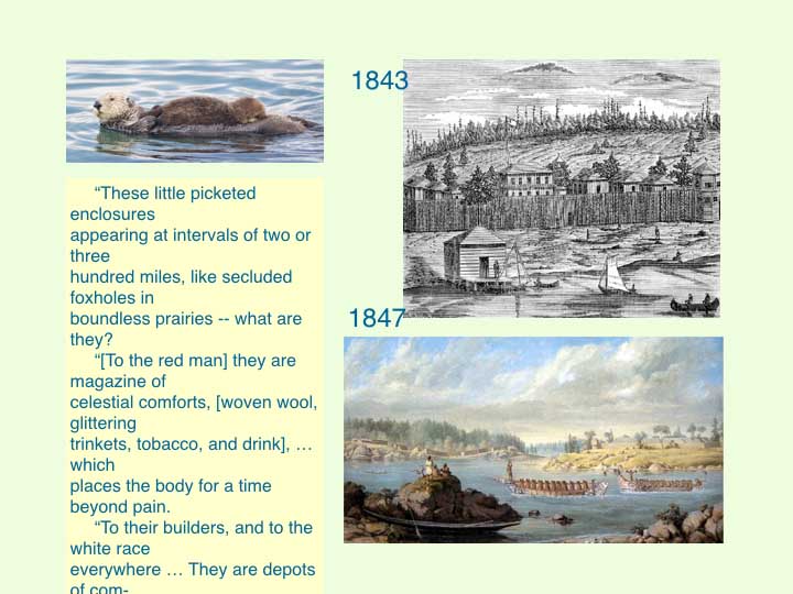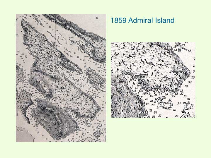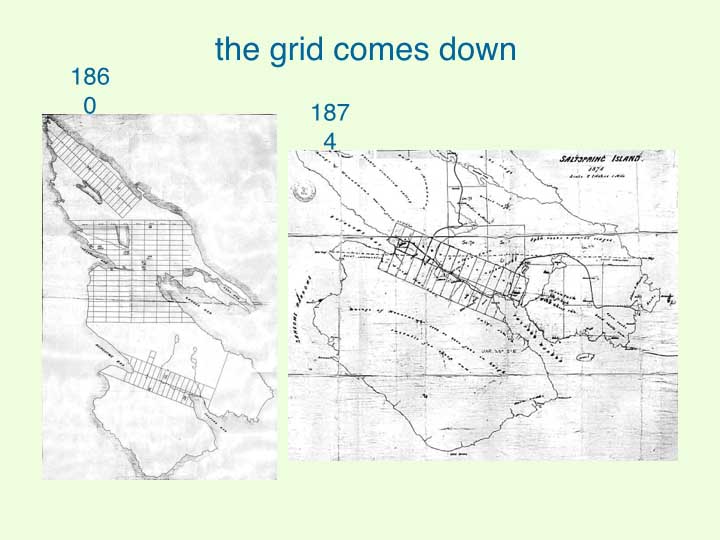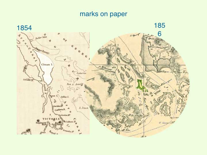 So the 1780s to the 1800s, they exploiters were here to get the sea otter, which they extirpated from our coast, which we know 1843 We get fort Victoria. And this is a little bit later when it built up. It's just a few years later, that fort, the Hudson's Bay Company had its for at Fort Vancouver and up the Columbia River and Oregon, and to what was going on between Great Britain and the US, they had to get out of dodge. So the Hudson's Bay Company set up in Victoria, this is all stuff I'm sure, you know, but we'll stitch it all together. I really liked looking at this particular print, because behind them are the native cameras fields. And I'm sure the white guys just looked and said, Oh, look at the pretty wild flowers. I wonder what the native people do to eat. So the native people would come and try to gather their bulbs there and probably be told to get lost. So 1847 This is a pole cane painting. It's called return to the war party, and it's the Sony's people from Esquimalt, coming back from warring and if you look on the stern of the two war canoes, there's heads on pikes. What was going on? So they say, well, those native people, they were just always out there killing each other and fighting all the time and, you know, taking slaves and cannibalizing know what happened when the white guys came and set up their forests. The northern tribes came down to trade and they come down in the spring, and they trade all summer and then they go back in the fall. Well, that's a big long canoe trip. So where would they stop to eat? They stopped to eat on a beach where they didn't have permission. And that this was so contrary to the to the whole ethic of the whole Coast Salish peoples. So this is a quote that I just love about what these forts were these look ticketed enclosures appearing at intervals of two or 300 Miles like secluded foxholes and the boundless prairies and on our coasts, what are they to the Redman they are magazines of celestial comforts woven wool, glittering trinkets, tobacco and drink, which places the body for a time beyond pain to their builders into the white race everywhere, they are depots of compressed power, dominating the land and all that is there in they are germs of the highest human type, which will shortly spring up and overspread the wilderness, causing it to wither beneath its fatal shape. This man was here a white guy in 1887, he got it, that we were doing something to the native people. So to the topic of this, they were changing the landscape. The next the newcomers said, this is completely wild. There's nothing here. marks on paper or the way that they want it. So they had firearms they had firewater. That's true. But our law is based on scribbles and scriptures on pieces of paper. And you can have been someplace for 1000s of years but I've I come along and stick some put some stakes in the ground and I show you a piece of paper that I own it you know what I when it trumps everything, this is Captain Vancouver's chart. And here we have the little Saanich Peninsula and Saltspring above it is to the left and the tenders didn't take time to he was to map the mainland coast, not the islands. So 1792 the little sketches on paper are starting to take over 1854 I've had to redo these maps they are owned by archives that charge an arm and a leg to use them and I'm doing this project completely the book project completely as a donation to save in the old monk farmhouse. So I don't want to be spending 50 And $100 Every time I turn around for an image and bless the Saltspring archives times over for the use of so many of them, you know and everyone who's contributed it's just the most amazing resource. So Chuan was the name of our little island as you mostly most people would know. Only briefly 1856 It showed up the Salt Spring Island, we're starting to get the shape of it much better. Two words for Salt Spring it looks more like a bunny than a pterodactyl. They left out long harbor. But soon enough, they got that working. So 1859. Before 1859 It was named Salt Spring, one word and Salt Spring two words is matched with both so they solved the problem for us. Wouldn't it be nice in a way if it was still? No, it wouldn't be nice. We need to maybe give it a native name if we're going to rename it. So this was from the Thumper Captain Richards under animal beings when they came around and did their survey in the close up of beaver point LNR point I just love because you can see the names that have been going since 1859, Channel Island beaver point, Eleanor point, Isabella point, et cetera. Isabella and Eleanor were apparently the daughters of two officers aboard one of the several surveying ships and I mean, I, I suppose I could devote a month's defining of who they were there's record somewhere but I really haven't delved into that one. But nice that they're named after girls and women. There's not that many. So traffic you're standing we're getting we're getting back to Eleanor point. So if you're standing at Eleanor point, since time immemorial, you're going to be seeing these canoes going by and when the newcomers moved in the canoes and the native people were really useful. They ferried people around, they were very helpful they did their trade from and then in 1836, the Hudson's Bay Company got the steamship dever built in England brought around the car to be it sort of floating for trade factory working out of Fort Vancouver. And so the standing on Eleanor point you'd have certainly seen this chugging and puffing by and when they found coal in an IMO, it meant that it could really open this area up. That was really key because it was it belts a lot. This is the plumper Captain Richards doing it survey. But you haven't seen anything yet standing on l&r Point seeing what's going by, because this is what's coming. This was the gold rush. And within about two years, less than two years 30,000 Guys, mostly guys who can't follow or women. Mostly white, some Chinese c
