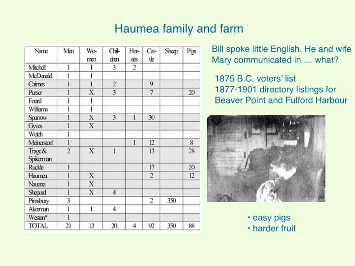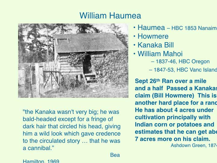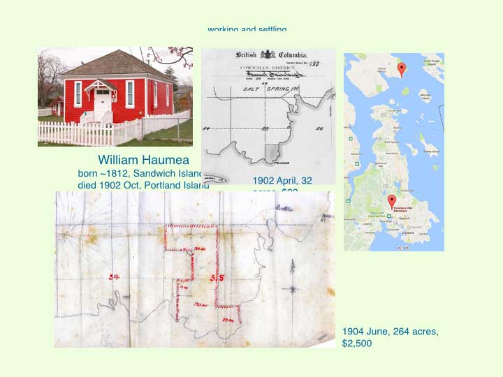 So meet the l&r point, neighbors here we are Ashdown greens map of Eleanor point proper. That's a close up zoomed in on his larger map that you just saw. Point open rocks but Katelyn well I live down here. Let's not open rocks now. Let's forest. There are clearings for fruit trees. But this is what it was like when the first free after he said how Mara. That's how may I William how may a Hawaiian Salah Hawaiians were treated as British subjects, particularly if they had served the Hudson's Bay Company and make it three out loud, but otherwise only British subjects plus the lions and that's why I say newcomers because it wasn't all white guys. Why was it open rocks? Well, I think it's obvious there were countless fields. Probably extensive Camus fields is perfect for that. So he didn't have a lot of clearing to do. And then we have Abel Douglas, who was from New England. He was on Main Seafarer he was a whaling captain. He had Scottish roots. He liked to spell it with the two S's and I will check my manuscript to make sure that I consistently have because I think we need to honor people's names and what they want to be called. So na t 77. This is the map of l&r point where we got How may I fill that in and then we have Douglas on the right and then it was John or Joseph King who was actually a Greek so that's just a completely anglicized name. Oh, and then did you see Did you see the little little colored spots that came up? That's where they have their their cabinets. Their little preempting cabins were to be 18 feet by 24 feet minimum. Well, I don't think all that many of them actually complied. I think there were smaller home sweet home. Some of them had no windows. So let's go meet William William Howe math. I don't have any pictures of him, but this was a later cabin that was further back behind his part of his orchard. This is a 1908 photograph taken by Sal Simons who was the beaver point school now a little red teacher. And that building's long gone. There was a William Han there. And it would be this guy who worked for the Hudson's Bay Company in the Nymo. In 1853. He was a coal miner and in May of 1853, he got in his canoe and he thumbed his nose and he paddled away and he said, you can take your job and do something with it. The coal mining was absolutely brutal, and it was killing people. They were all getting sick from doing all the work. So we're in Palmyra disappears from the official record regarding the Hudson's Bay Company at that time, but he was known as connectable by his friends. He was also I believe we have any direct proof yet although there's more and more records being put up on the internet. I think he was William Mahoney, and there was a William Malloy and the Hudson's Bay records. We started in 1837 at Fort Vancouver, and the Hawaiians were hired mainly flooding refrigerators and helping with that, but they were growing food. So they were they had come they were farmers on Hawaii, they serve the aristocrats they were serfs. They were peasants from Hawaii, that knew very well the power structure of the Europeans and how to be a good pianist essentially, and crafters. And then he moved up to Vancouver Island. He was at Port port Rupert, which is no fort Rupert fort Rupert, which is port Hardy now 1853 He's out of service. I think he was this one in Mojave. Assuming he saw me I was borrowed from Fort Rupert to go down to Tim and IMO. The Hamilton wrote that he wasn't very big, bald headed fringe dark hair circle. This had the wild look. That story circulated that he was a cannibal. I find Yeah, I find when I'm reading stuff, and this is where I really love Captain Vancouver stuff. He never even passed on stuff that is jocular and kind of funny. But, but you can tell the attitude in a way of society at that time toward the brown skinned people. Ashdown green that said that he had picked a hard place for a ranch because it was rocky there wasn't for us like it was well for us to fairly well for us to now four acres, Indian corn potatoes, and he thought he could get seven more of agricultural acres out of the open rocky ground. Who was he in the community? Well, Greene very kindly put together a table of the man that he met who had preempted. So these are the south vendors from her going through the beaver point. So in here we have Henry rock. Well, he'd only been there a couple of years. But we've got how math and the x's for the women are the first nation wise well, you can see that more than half of them have First Nation wives. And I've written about them. But in my book I've also made I've pulled them out of the general chapters that are headed up with the man's family names and I've given them their own chapter. So there's just little summaries of these First Nation wives. There's a lot of birth and death dates. There's a lot of photos that that section is really dear to my heart. You can see that they grew a lot of pigs. Well, why did they grow a lot of pigs? Because the pigs ate Camus bulbs. So hundreds of years of cultivating and farming. The cameras all went up and a few good years of pork eating homemade Canac a bill spoke little English. His wife First Nations not don't know where she came from. But she spoke either since shopping or help a minimum likely or how can I help him elm up the freezer. So what would they communicate him? They spoke they spoke the dialect if the area they'll have Mayor was a was a good citizen. He was on one of them. He was on the earliest voters list that we have directory listings every year every year until he died. I just took this photo and because it's the only photo I know a lot of the ants from 1908 of the inside of his little cabin. This is the wife of several Simon's they lived there for a year and the baby was was not born there but came home and spent part of his first year there. They were dinky little dank, dark places. And you know the women operated out of there more than the man did. But boy, not the way we liv