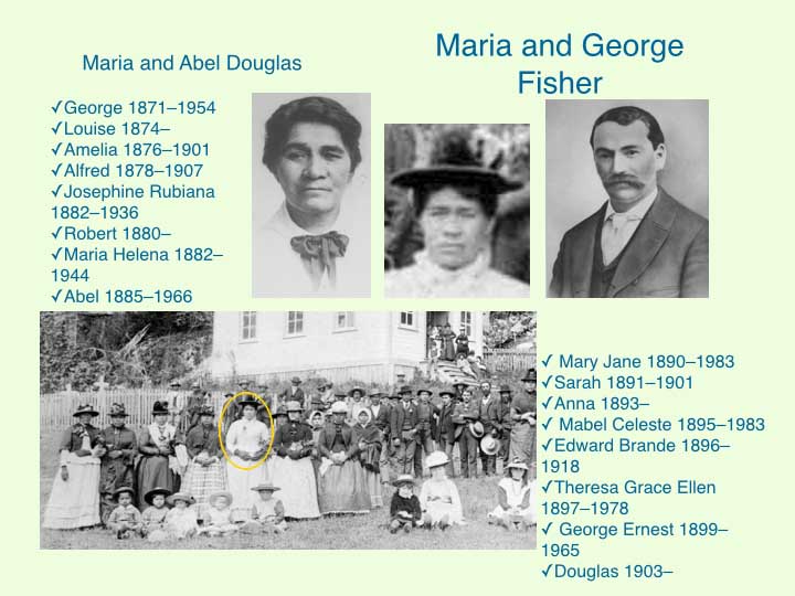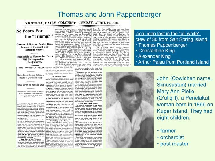 This was her husband for me. He and his partners caught eight or nine orcas in the in the Salish seas in the streets here and then they figured they kind of fished them out. So they moved up to Cortes Island, and operated out of what they called whaler Bay, which is why it's called Wally Bay. And they took all the orcas out of there within a few years, and then he folded his business. In the meantime, Mariah was having children and children and children and children and children. She had eight children with this guy. And then she decided enough, the First Nations women, her mother was from Vancouver Island. We're not sure what what bands here what group she was with. But they weren't so tired as the as the White lives where they could go back to their home reserve as things were getting uncomfortable at home. So anyway, Mariah moved on. She became Mrs. George Fisher, the George Fisher fat story, I could give a dozen talk spinning off everything I'm saying here and this is a really big one. His father either was murdered or committed suicide when he was a few or maybe just shot himself accidentally when he was a few months old. And then his stepfather committed suicide. So anyway. Amazing. family stories are good people. Brian Malloy and her middle age now I threw this one in because a I just love this photo. We're all familiar with it. Nobody knows who's in it. However, since Frank has kindly sent me high resolution pictures. I'm zooming in on all the faces and to see who I can recognize. I'm pretty sure that's Mariah Mahal. I don't think I work as a portrait. I did work as a portrait artist as well. So I'm pretty familiar faces and contours. And we all are, but anyway, I'd say that's her. And maybe her sister Mary is standing beside her there, you know, maybe we can start to identify some others. So with George Fisher, Mariah, who was a midwife started having babies. 23456 716 children. She must have loved it. She died when she was 86. She was on muscle island where she spent a good part of the last few years and apparently she was out wrestling octopuses for supper, right until she was in her 80s fabulous woman next door in this property was able Douglas Old that he sold it to the poppin burger family. And he didn't sell it to vote 1886. But who are the poppin burgers? Well, there was George Poffenberger, who came from Bavaria in 1857. So look at the town that he left. Isn't that lovely? And he came and lived on Vancouver Island, and he took a First Nations wife named Mary. We don't have a photo of Mary, but we have a photo of her sister. This is Lucy, Lucy Peterson, who was born on Pelican Island. And we can guess your sister looks a little bit like her. And I just love these old photos anyway. And then you've seen this picture already. And this is from the she married Henry Samson, who lived in the north end up near St. Mary lake. And it's probably it is, I would guess it's her and Henry Sampson in the back. And again, I can zoom in on these pictures now. I think we've identified for sure who's almost for sure. Who is in that photo, and I think it's mainly pizza. So Lucy pizza. George's wife, Mary, had children, and children and children and children. There may have been another one named Emma. I'm really tracking that one down. Boy, it's a mystery. In 1880, George Poffenberger and his oldest daughter went to visit family in Pennsylvania and they died of TB. They probably had TB before they went Pennsylvania was had a lot of cemeteries sanitaria for people to come with TB, so he died in 1880. He couldn't have bought the property van. However, why is that? Okay? He had these two sons Thomas and John poppin burger and I expect that they're the ones who bought it in 1886. Thomas lived there for a number of years. They didn't have much impact on the land after the Douglass left. I'm sure that Douglas is put in a few fruit trees. But he was he made his evil Douglas made his money from whaling and sealing ceilings when he got into severe impacts on the land wouldn't have been great. So Thomas Poffenberger worked sealing maybe even got started through April Douglas, and that an Oregon newspaper reported in 1904 in the spring, April 15, that this ship, this ceilings ceiling vessel, the Triumph had been lost. And the daily colonists weighed in a couple of days later and said there's no fears and you know, your fear mongering these are upright ceiling companies and nothing's happened and all 31 guys on board, there's no problem they're gonna come home. So great, long article and really razzing The Oregonian paper. Well, the silence spoke volumes. Thomas Poffenberger didn't he never came home, the two King brothers and then the who were half Greek half First Nations and Arthur Tao was half Hawaiian half First Nation, Swift, important Island and had connections to the west side of Fulford. So this was John Puffin burger. And he set up and raised his family on that property. And his wife was also from Connecticut, as it's known, now called Ireland. And they had eight children. It seemed to be just the number and a lot of them survived. These were robust people. I mean, maybe a lot of them didn't. But this is astonishing. He was a farmer. He was an orchardist. He was the beaver point, Postmaster for a number of years. So he started to dig into the landscape, how many trees he had to take off? I don't know, there might not have been that many of them because again, it could well have it said open rocks right across even their property in 1874. So we'll move along really quickly to the King family. They're a huge family to get into and we can't get into details, very story. He was from Izmir, or Smyrna, which was part of Greece and up until 1920. It's not part of Turkey. This was his wife married sis, isn't this the most beautiful picture just wanted, she was a strong US woman. Her father was a chief and they even got into substances which is nice so you can track a little bit. She came with a daugh