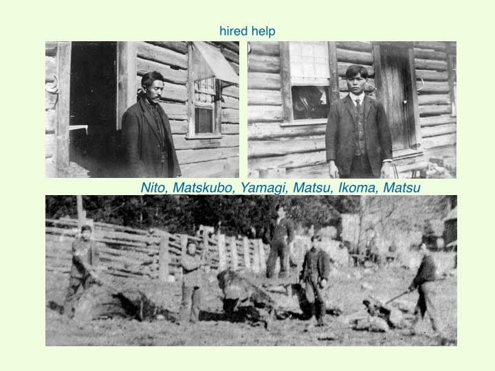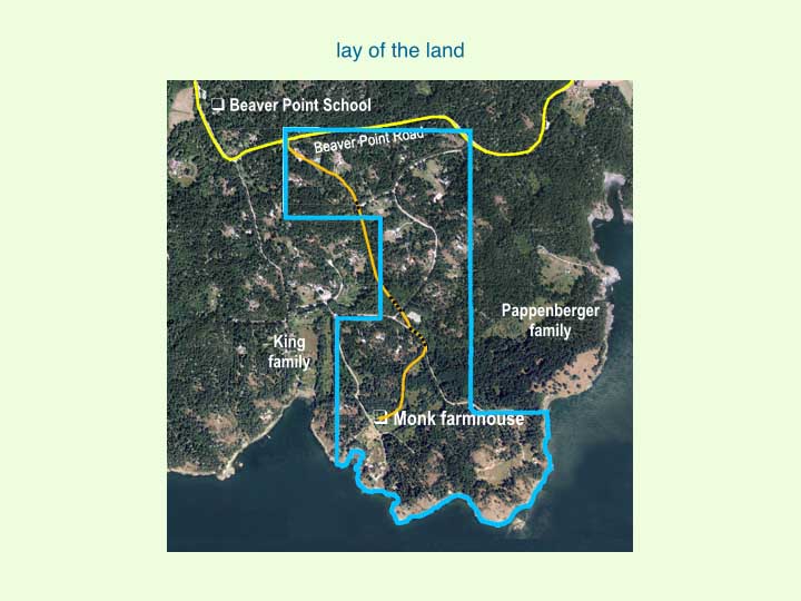 And this is what Jim Mark ended up buying. And apparently he did go by Jim all the time, not only to his family, but to his neighbors. Mr. Month to his students, of course. So he bought 264 acres for $2,500. So his neighbor and possibly friend circle due to that business transaction, home and commute while he continued to teach at the strawberry Vale school for a number of years. So where did he live? Well, this is that old hummock cabin that you've seen before. So I'm sure that he stayed there, at least on weekends. And then the could take the theory that this is the Isabel steamship that stopped at Fulford harbour, this is circa 1905. And not here very soon. This is 1908 He got himself a boat, he probably got one beforehand. And Leon and Sophie King next door probably built it because they built more than 80 of these gorgeous boats. That looks like one of those. This is how he commuted to Victoria, to spend Sydney growing up and went straight from Sydney right up by a school very handy. He had hired help. Now these photos are particularly precious because it is so difficult to find anything about the Japanese and Chinese people who were not allowed to pre land and to take Crown land in this way they could only purchase after years later. So we have neato This is Cyril Simon's photos and he names them this year. I can't tell you how special that is that he bothered to remember their names and you know, try to spell them right Matt scoobo. So here we're doing a little bit of lamb land clearing, these are five of the guys. I can't tell you, which is which but these there were there were six of them that were working there at that time. And they all have names. Yay. Brian Smallshaw, who is doing a master's thesis on the Japanese and Japanese Canadian people on Saltspring. This so he's he's very thrilled with these photos. We ended up with a barn how many years old cabin and a monk farmhouse. And here it is 1908 and we got the proud owners on the doorsteps. That's me monks and Jim monk. And the guy in front is probably Charlie Munger. Jim's brother came out a few years after he did and they call it Fernhill farm. So making inroads I've taken a Google Map and I blot it out the road so we can get an idea of some of what was coming. I mean, it's pretty chewed up. But anyway, first of all, where's the water? Here's the water. So I think I'm going to go back because here's my