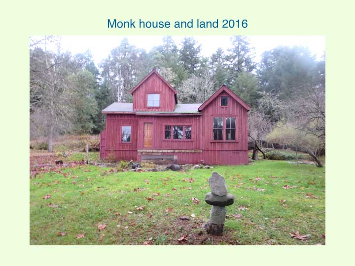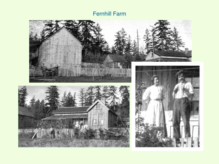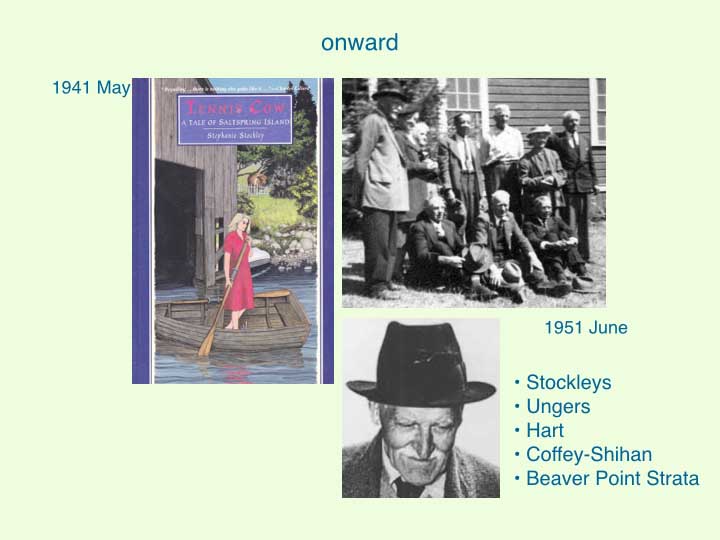 Can you see what that pond is you can see it on the ortho photos and and on the satellite. So that's an irrigation pond. That's not a natural pond. Although it's a year round. There's a swamp just to the northwest of it. And then there's another little pond a little further Northwest that was was dug up. Water Systems We got the King family coffin burger family and get the monk farmhouse, school car you have roads. This is how you get to your property. The king family's road became king road. And the top of Papa burgers road remains private and the monk road is mostly private in the middle hatch, the little black striped areas where it's still public, and you can still see vestiges of it the whole way. But if you do go to take a look at it, don't go on the private property, please because the owners are a little sensitive. And there's some property so fruition and beyond we may mark two kids so they had two daughters they had a son is the same obviously grown up there's Uncle Charlie that was helping with everything. So fruit sales, livestock teaching, this is how you make a living. Even Jim Mark worked for the younger handy record for a bit. But on 1923 Christmas Day, may mock died in Victoria TV. So sad times we suddenly had a widower with three young kids to raise not able to teach at the school anymore. And then he hit the dirty 30s And the whole assault spring suffered during the dirty 30s and particularly the fruit growers so the fruit growing Bonanza days before were just just gone through hard times and through transportation issues. 1935 January 2 was another important day to Jim month because his son died. He he died in that lady Mental Hospital communicable disease and he died very quickly. So there goes the one that was going to take over the farm and run it and he was a good young farmer apparently. This is the monk farmhouse circa 1936. So you can see he put the the only addition is the is the kind of second story bedroom you can actually stand up stairs which is nice. So onward. In 1941 Mr. Monk, but his farm next Mr. quotation mark suit he called Kirby 1951 He came back for the closing of the beaver pump school. He's the tall guy on the left. You can see what David O'Flynn for those of you who know him while we got a six foot 10 inch height packed up there just thought it was great. That tall saw Simon's on the right. That took some of these amazing pictures. This is Mr. Monk not long before he died. So I'm gonna try to get a better picture, the best we've got. Now, he sold the place to a woman named Stephanie Stockley, who in her old age with her daughter wrote this book, and it's very telling that it's called tennis cow. This is what I call the third wave of newcomers. Yes, they were purchasers. But tennis cow tells you that the cow had to put up with being milked as did all farm chores with the tennis shedule. This book is a delightful capsule of the time and what's the the English people mainly on Saltspring we're doing but it just seemed to be a long string of parties and costumes and drinking and smoking and, and the poor cow had to wait to be milked and better get used to it. So it was a whole different crowd that came. Mrs. Stockley couldn't pay for her. She was widowed and had a teenage daughter when she came she couldn't pay fully for the property and she didn't pay the back taxes. So some of it reverted back to Jim mark and it went to his daughter Margaret, back to so that that the family still that east side of the property. Then we have the Ungers, a lot of people, particularly in the south in New Haven always spoke very well and I don't know any of this, I'm afraid before we sold the rented so neighbor, Jamil hearts that one of the sisters was born in my farmhouse as of last year. The Beaver point strata which got started in 1985, cleared out the house, and we're set to burn it down in this past February. and the fire department was going to do it. And the Saltspring community got a little up in arms about this. He said really, you got to be kidding. 10 year old, perfectly useful home actually. But there's no doubt it has to go and the strata has agreed to move into Rucker Park. And they will donate the the demolition costs which will be about $30,000. to helping to move it up to Rucker Park, I got a mover it's going to move near the end of November into December. So there's going to be this house rolling down the road soon. I think it's going to be a red letter day on Saltspring. Lots of photo ops. So this is the month long house now. Different views of it. They strip the porch off the front. But this is what's ready to roll and why it's so perfect out at Rocco is a of course it's not a record building, and it's an interloper. But the floor plan is absolutely perfect for public events. So the living room is big enough to hold as 30 to 40 people so that there can be talks of various sorts history, natural history, farming, whatever. There's a kitchen to the side, there's rooms upstairs for park staff to have an office and accommodation for the euro caretaker that now lives out of a little kin box. And so it's going to work perfectly. And the other thing is it's been lifted for until last year. So it's not precious. The rental houses the two that are unoccupied. And the two that other two that may eventually the unoccupied they're truly homes. They're absolutely precious and they can't take the traffic's of this one can. They just can't. So when we open up an interpretation and administrative center through this old farmhouse, once this set up and running, we can start to open up the other buildings so that if you want to go on a tour, particularly in the tourist season to the original house from the 1870s we can start to get that going that old glorious queen out of Alfred rucklehaus. I'd love to see tourists through there. I've had the good fortune of being able to go through it and it's breathtaking. It is a time capsule fitness, you'd have to really assur