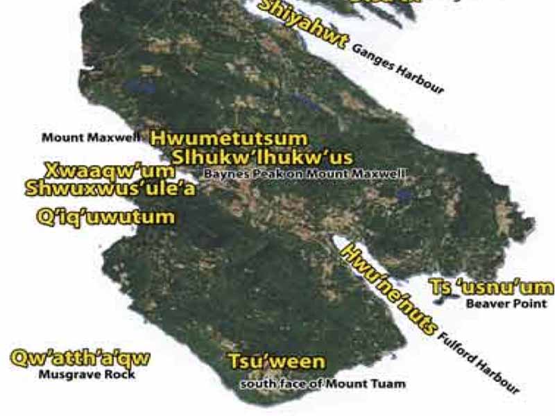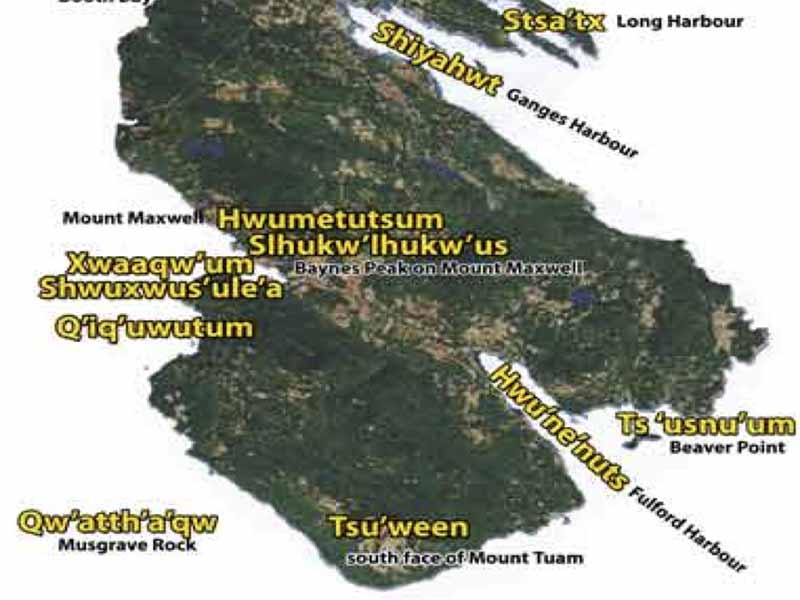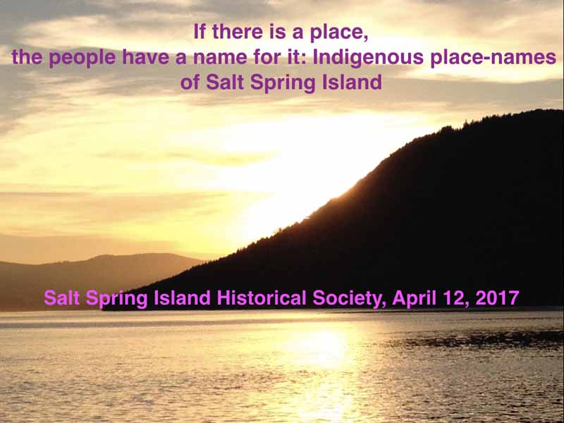 going to talk about a subject I've been interested in since I was a teenager. I grew up in Vancouver, Berardi inlet, fourth generation Vancouver, eight, our family came there in 1887. So I've always been interested in history, I was interested in the colonial history history of my family in Vancouver. And wasn't till I was a teenager, I got a hold of a book called Conversations with customer Leina was done by was put together in the 50s by Vancouver city archivist major Matthews. And so I got to hold this book. And this book is like an amazing book. And it was based on conversations with native elders in the 30s. But what really blew my mind about it was the place names. Because you know, I grew up in this area familiar all the history into the non native history. And all of a sudden, this book was filled with place names of Vancouver, like for stat for Silas Ross, for chaos, or for, you know, all the different names. And in these names, there's a whole hidden history that I hadn't been aware of until then. So it really taught me that, you know, language, place names is really a window into other cultures. And I'm also a historian, and I was excited to learn this material. And I began to study archaeology, because I don't think history ends or begins at any certain time, like a lot of people think history begins with the Europeans here. And nothing could be further from the truth, you know, the history here goes back 1000s of years. And so a lot of my work involves, you know, joining that non native history with the with the native history, earth, that joining the native history with the non native history, because it's just a long continuum. So place names are part of that. So when I moved to Salt Spring, you know, I got very interested in the history of this island, and claim to talk about indigenous place names here, and how they give us this window into the past that we wouldn't otherwise have. So we're really lucky to have these names. So the title of the talk, if there's a place that people have a name for it, indigenous place names Saltspring island I didn't come up with this title is Roberta did, but she based it on a something I mentioned to her when I was working in the Sinai valley in the 80s. I was doing ethnographic work for the first nation. And one of my jobs was to document place names in this valley. So I would interview elders about the areas in the valley, where they used to go and gather things or weather stories. And one day, I was, you know, asking an elder about place names. And he said, if there's a place, Indians got a name for it. So that really impressed me thought Yeah, you know, because people have been on the land for so long for 1000s of years. Intergenerational knowledge. I mean, people were intimately familiar with the land, particularly when it's part of their, you know, economy. So moving around in the land was essential to their economic well being. And so when I moved to Salt Spring Island, I got really interested in this material here, because, you know, again, it gave me that insight into the past, that it's kind of difficult to find otherwise, you know, place names have it all. So, you know, I began interviewing people. Before it gets to that, though, I just want to talk about the names. I mean, we're, the native people lived here, part of the great Salish nation, if you want to call it that it's a it's a huge area that goes from the east side of Vancouver Island, all the way to Idaho, up towards, you know, Lloyd area or even further up to, you know, dark Creek and then down to the Columbia River. This is a huge area, the Salish nation, and in this area is about 25 different languages. And even in this area here, we can see some of the different languages or different dialects of Holcomb, aylen. And so here's something in the middle here, and you see these linguistic design advice go right through the island. So up here you have a hook can eat them. Language, which is a dialect of help from anyone related to all these other languages have got the Fraser and then right down here, you've got st Jonathan, which is also called the straits language. And it's a very different language, there's a lot of common words, but there's different as a French and German kind of thing. So a lot of linguistic diversity in the small area. And this is reflected in the names to somewhat. So most of the names I'm gonna look at today are in a hot commitment language, because language I'm most familiar with. And I've worked with a lot of help Canadian elders, but I've also worked with a lot of the Sawsan speaking people too. So I have a good, I think a balanced information about these place names. But one thing about the place names on Saltspring, whether it's in Hopkinton or St. Shortland. It's the same word you just spelled slightly differently, pronounced different so and of course each tribe has its own rating system. That's the rating system and that's the whole kimete And one of the more computer friendly so you have to have a bit To command of this language to, you know, learn how to place names. So um, so I began this on my own when I moved to Salt. I had lived here almost 30 years. And then in 2000, or three, we got a tiny little bit of money from the archives for traveling expenses. So Bard Lingard and I decided that we would go and interview various elders on Vancouver Island and Connecticut Island, who had connections to Saltspring old family connections. And like, for example, this gentleman Arbic Charlie was team. Some of you may have seen him, he was very active in the grace eyelet, saying, and Barb linkerd is a descendant of a calcaneum, a woman couch and speak from Clem plantlets, who married a settler, John Maxwell way back. And so we went around and interviewed these elders. And so a lot of the information I'm going to talk to you tonight has come from me like arbitrarily, I'd like to also acknowledge, acknowledge that August, Sylvester if inelegant Isl