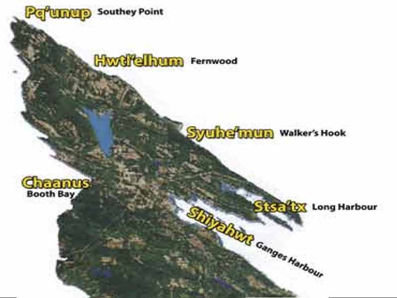We started a map. So this, this is a map that you can see on the website. It's, it's a bit out of date, but we're going to update this. And so here you have maybe a dozen names. But we found in the course of our work and, and looking at the work of other scholars, we've got about 30 to 40 place names on from salt spring island. And these are just some of the more wellknown ones. And some, so I'm not going to talk about every name, because they'd be here for hours.