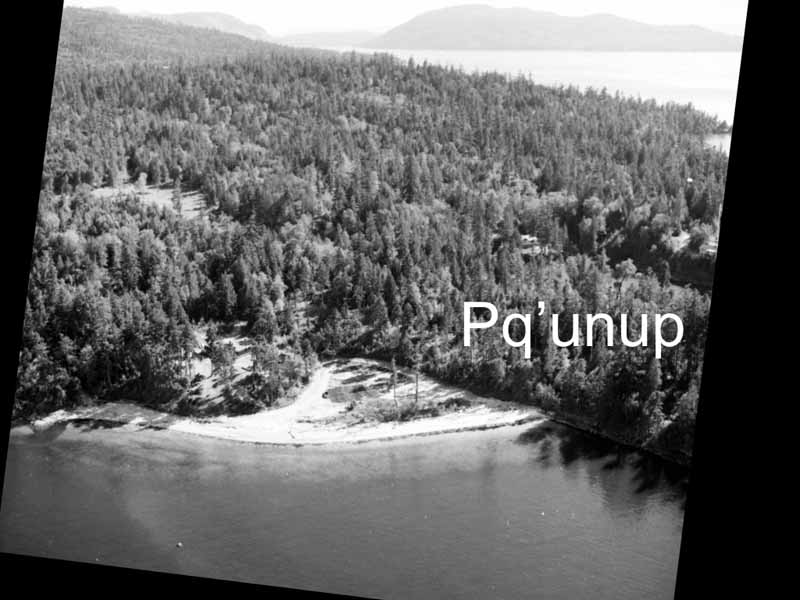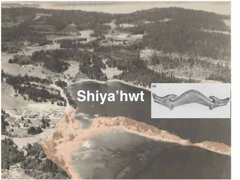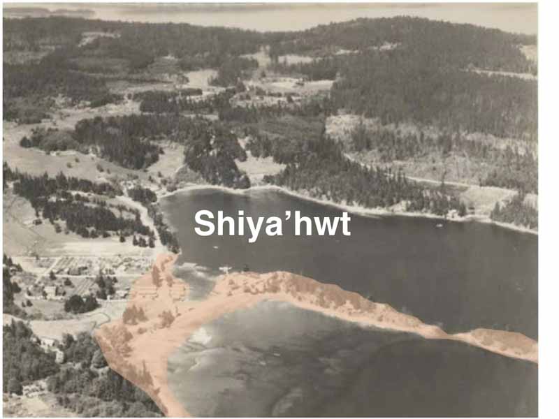credible feature this the white shell beaches hook is white and up is ground white ground. And there you can see the site's been a bit messed up by the owner there but there's still deposits there, but that's white shell Brown, descriptive term. And then there's this place, show Heitmann, which is Walker sick. And very interesting places the large village site that's an anthropogenic spirit, that spirit wasn't made by nature was made by 1000s of people living there on the land, building up the cell mitten and refuse over centuries, maybe millennia. And it's an interesting name, this name when I interviewed elders about it, and nobody could come up with a good translation for this name. It was like, yes, my guests, you know what it meant, and, but I live right here is just down below where I live. And it's a big day here. And there's very interesting acoustic qualities in his day. So one day I was out there, it was out of my deck, just listen and hear the waves crashing on the beach up there. And it goes. I think that name comes from that. And that's not far fetched, because a lot of indigenous names are, what's the word on the McCoy yedek Poletik. Thank you, you know, and this is very true of the of the hook any language or any indigenous language around here, for example, you want to learn start learning how can eat them, you start imitating the birds, the red. What do you see though, those are all the sounds they make. And the same, a lot of place names come from the land is white. It's an ancient language that literally has emerged out of the ground here. And the critters, the wind in the trees has has names that evoke those sounds a stickman. And there's just a visa statement. And like I said, chitlin, this is all built up. And here's a photo I took years ago when there was some erosion showing the means as a side of the house. So here's the floor longhouse. And these are posts that stood along the edge of the house holding the boards in place. This is a large, long house. The site's never really been explored. But it's a very rich archaeological site. Titman another great one, long Harbor, the hook can eat them and some chocolate name, all the names are in both languages. Stop. So that is this guy, halibut that apparently used to come in here. And they used to fish them here. And so that's one account. I hear from an elder and then I interviewed another elder, and he said, Oh, stop. There's a rock formation on this inlet. And he says, looks like a big halibut. So keep your eyes up when you're canoeing. And it's somewhere around the the entrance of long harbor. But long harbor courts is lots of evidence of use and I interviewed elders who used to come here in the 30s and 40s. And dig clams. Collect herring, you know, they fall trees in the water and the herring deposit row. That was a big, big thing. And if you if you notice, as you're going along, you'll see little pockets like white shell areas, either on old campsites and someone long hug or very large. And there's actually burial mounds up in the woods in the back of certain places. So there's obviously a very large indigenous population. And this if you did an archeological dig here, back in the 70s, found the oldest states on the island of 4000 years old from a large site with about 40 burials in an area less than a third the size of this room. So there's a lot of history of bury there still that very little has been studied. So now we're gonna move to the central island or central part of the island. And look at here this is my great postcard. When you go to mow it's you know, you gotta grab one of these. It's the good old days it's just beautiful but it gives you an idea of what Ganges looks like Ganges they're ready for the all the developments. This is taken in the 30s so Ganges is named she holiday is the name for this area. Again, Barbara and the original village site here. And slug line is Boothbay don't know what that word means. People don't know. A lot of these names have been kind of forgotten because like I said, they're these maybe on the plate names or or are so old, are they Yeah, connections with a lot. And shyness is the name for booth canal. And for a canoe skid that used to go from birth canal across overland and kind of follow this creek bed here and then came out down here in front of the kayak place. But this was a very well used route that save people I've heard anything from some people said, yeah, one to two hours to get across here. It was dragging your canoe over corduroy logs and things as opposed to that seven hours of rowing. A lot of people accessed. This is a major kind of corridor from chumminess couch and Bay to Ganges Harbour. So look at, here's just showing you the head of this canal, where the beginning of this Portage was started, you know, high tide, you bring your canoe in here, and then it go up a canto Creek, just a little bit inland here, and they've taken it quite a ways. And then when the ground got higher up, they would, there was a section of corduroy logs, and I interviewed an elder on that Connecticut Island. Henry Edwards, who told me he went here in the 30s. And he could find traces of this old road still, but he left because he was afraid of the white people. That he went there to look for this old route that his elders had described him. So why was this so important Ganges. This is a map from 1955. And anthropologist named Homer Barnett, who wrote one of the first sort of comprehensive studies of Coast Salish. And he was interested, you know, you heard a lot of stories of people here, doing this yearly migration to the Lower Mainland. And here you can couch and all these lines. So like Saanich villages and Nanaimo people, they all converge on the Fraser River because of its incredible Sockeye fishery. So people here were very much connected to this place called sluttiness. And focus is up there. It's just past the George Massey bridge. This is a large couch a village. It was 