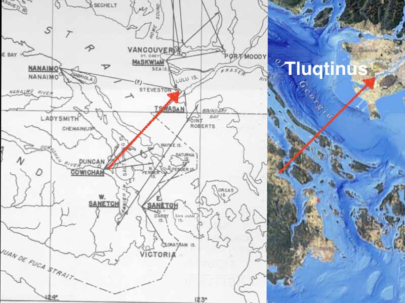 This is the earliest reference to Saltspring Island. We have an historic record. And this was a map done by James Douglas in 1852. And so in 1852, they knew about this area and see the map here is really detailed, and they're basing it excellent early. Admiralty master once you get up here, you know, this is like what the heck's going on? They had no clue. And so the reason this map was done because they found coal and an IMO, and so Douglas went to check it out. So he went on a canoe trip anywhere around here the oldest area that he and when he got around fort de he noticed this huge you know, island over there. And so now he obviously he had a guide with him he is a guide, you know, what's that place? He said, Tron Tron. And so that was the scene of it was a name for the whole island. And so hence the name here Tron Island. Of course, these places on the island are named Swan place and that and but that place name, only referred to this land for him swim lane lane, which is the name for that portion of Saltspring Island. And swaying just means coming straight down to the water. So if you're in store today, and you look over at Saltspring, you're heading towards Salzman, you know, and then when you get below the mountain, it just has this feeling of sheer know coming down here from the top, flat, swaying, that's it. And, of course, this name, layer corrupted to trois Thomas derivated derivation of that indigenous name. So that's kind of interesting. And so and you'll also find this nearly colonial correspondence that again, referring to Saltspring Island as Toine, Island, Toine, or Saltspring. And that and what you find, as you go through the different communities and people, they named the island according to sort of their proximity to it, if you live sort of on this side, you know, in Saanich, or down in Cowichan. And you came over this part of the island, they used to call it they refer to, in general as Toine. Or sloth slang, slang. And if you went to the north side of the island, you'd refer to it as Lakeland, which is the Saltspring. But we'll get to that in a bit. So so this is a very important place in in the mythology of it. And those if you go on the exchange, a little story there, I won't go into the whole story about this individual. That's a hurricane with an individual but also a, it's also a place name on the top of Mount Juan, somewhere on Mount Farms, a very sacred important place, like when you interview knowledgeable elders about the place, they won't talk about it. And so right away, if you weren't talking about it, you know that it's sacred and very important place, they're not going to start telling you all secrecies about it. But the story is that hey, look, and it's basically the short version is the lightning is the lightning AI. And he was an individual who went on and his vision quest and acquire incredible supernatural power is basically his power came from the Thunderbird checklist. And he had ability just opened his eyes and lightning was chewed out and you just burn anybody to a Chris, who was in front of them. But so so what happened instead of using these powers that he had for good to help people, he began to become a sort of a desperate, and he built a house up on the top of Mount swamp, and began to enslave people and, and ordered them to send all their daughters and women up and send up food. You know, he was a total desperate. So this is typical teaching in, in First Nations stories, that kind of negative teachings that there's stories about bad behavior. And so when we started studying these stories ago, those natives are all crazy fighting and doing all this stuff. But really, the stories are preserved to teach people how not to behave. So in this instance, he, people begin to get set up with what he's doing, and they kill him. Eventually, they bring up the big roasted seal, and they break it over his head, and that covers them with all the fat, and then they stab him to death. But he's still believed to be up there. And it's interesting, the area is still has sort of a sacred quality about it. Because this Buddhist leader Rinpoche, somebody said sorry, I don't know his real name, selected the Buddhist monastery from the sky. They're safe. They're flying over salts for you just pointed down. So that's where the smartest series is gonna be. Yeah, yeah, he picks a trip Yeah, from the sky. So it just shows this. These places have some sacredness that can transcend cultures anyway. Let's say hey, look at Yeah, very important place. So that's just the south and just to give you an idea about place names and some of the things associated with that we're just going to look up at the north end here's a detail from our map and look at so that's the name slain has been preserved in Melbourne and the only the the other native name on the island it's been preserved is a name for Saltspring Island Salt Spring, which is what flexflow Now here we are met with Cleveland, specifically referring to fairway, but what lake when really refers to this whole area, including St. Mary's lake, so it's basically the north end of the island. So if you're living on Connecticut Island or over into Maine This, they would think of such thing as select one. And because that's what's closest to their villages, and it's an area that had lots of resources, I mean, the lake is largest in the Gulf Islands, a very important place. So click Lake limb, place of Salt Lake was soft place with salt. And upper refers, of course, to all these unnatural Salt Springs. And here's one of them on one of the properties there, as you can see spectacular and exciting, although you go here in the summer, and they're much different, like the basically the low mountains, and the salt is pickled water just out of the top and kills everything like are they anything grows here. But in the summer, it's all covered with white crystals. It's really quite beautiful. And I believe there's about 14 of these spri