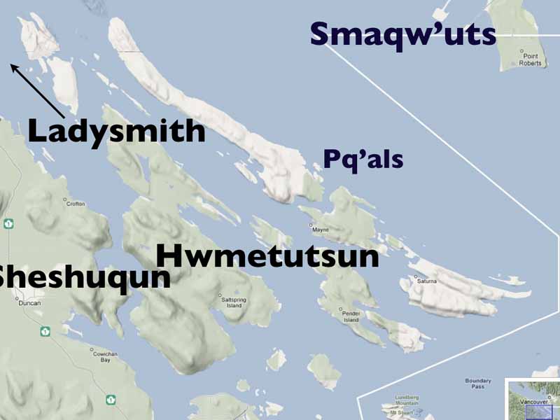 And so here's filtering in the middle here, and you see these linguistic design advice go right through the island. So up here you have a hook can eat them. Language, which is a dialect of health related to all these other languages that go up the Fraser. And then right down here you can, you've got some shot them, which is also called the Straits language. And it's a very different language, a lot of common words, but there's different as French and German kind of thing. So, but lot of linguistic diversity in this small area. And this is reflected in the names too, somewhat.