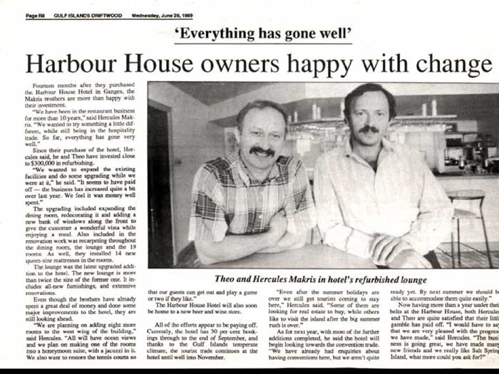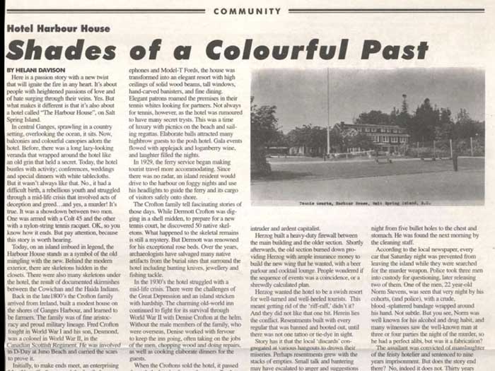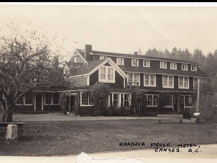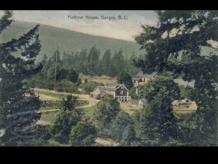 covered veranda wrapping around. Today, the hotel bustles with activity conferences, weddings and special dinners with white tablecloths. But it wasn't always like that. No, it had a difficult birth, rebellious youth and a myth and struggled through a midlife crisis. Helen Davidson put it that way. Now, I'm contacted to do this presentation because I've done research for a book about the harbor House Hotel for Jack Woodward, to celebrate its 90th anniversary. Its 90th birthday. That was 2006. And the working title of that book that Jack wanted was auto biography 90 years a Saltspring icon. Jack, the owner at that time was thinking of the story from the point of view of an old lady reminiscing about her life so far, usually sedate, but interrupted frequently as rather racy incidents. So I bet that Jack has recently read that, quote, I've just given you a felony Davidson, and that gave him the idea. So today I'm giving you the biography of an old lady, the harbor House Hotel. I'll be divulging a few of her secrets. Not all not today. But some of the racy ones between the Civic achievements of a lifetime. The first 50 years of the hotel's existence were a family affair. That's a good one, that's the one I should have been to pick it through a family affair. So the how the house began as a whole family run result based in the cropton family spawn house. But before we get to the beginnings, the versus a hotel, I'm going to give you a little background of what came before. Just like an autobiography, you go into a previous anti sequencing, genealogy. But for a building once history is all about location. This place had a previous history, which is carried on like the genes of the family through the hotel to this day. I do have interesting material about the conception, but we'll skip that today. I will dwell on the difficult births. However, before splitting the life story into two parts, the first 50 years and then the next 50 years separated by the rather racy midlife crisis. The first 50 years were a family affair, a homely hotel, run by the prophet and family. The next 50 years were under new management repeatedly, again and again. Run by successive a succession of new owners. Most of you present will know the location of the harbor house at the head of Ganges Harbor. The spirit of what harbor house became famous for and very likely been going on right there for many generations previously. For many generations, Aboriginal and settler, the head of Ganges harbour drew people in for a delightful gathering together for feasting and dancing, the music and entertainment supporting the touching upon us and making memories that salaries who would return year after year, say whether you were Aboriginal for generations and generations before, or settler, right now