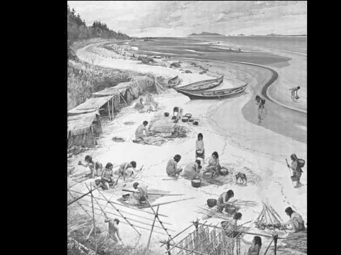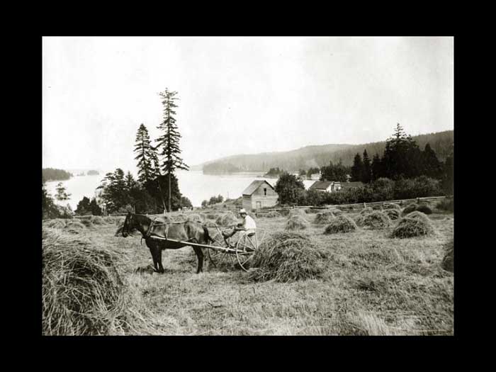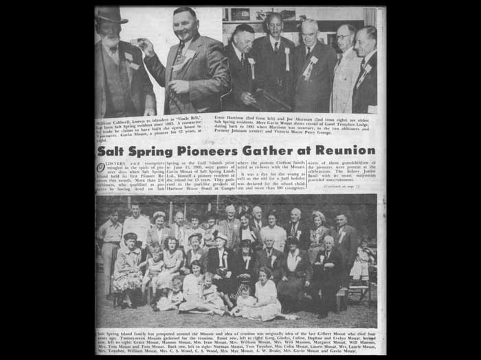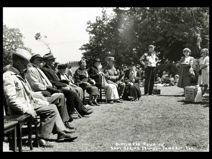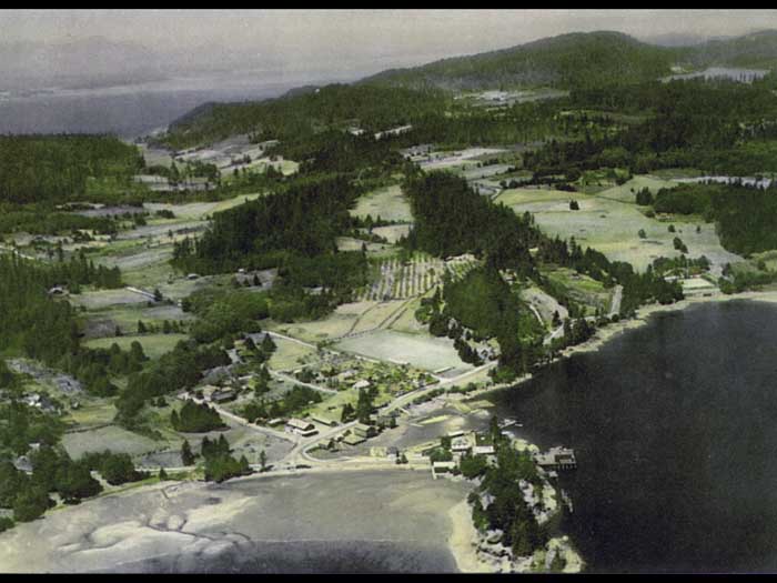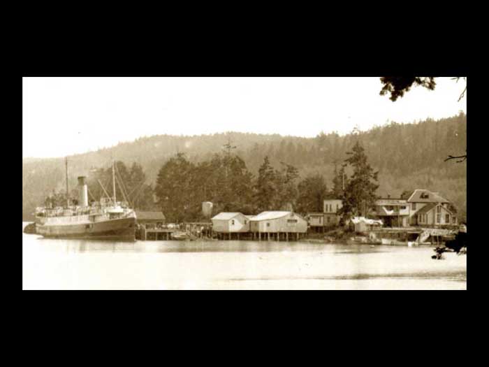 for many generations oops the location itself holds a strong memory. This location is known to the original occupants as those of you who have read Charles Khan's first chapter of the book Saltspring, the story of an island will have read that Reverend Wilson in his pamphlet, Saltspring Island 1895 wrote that as recently as the 1870s it was no strange thing during the months of May or June, to see the shores of Ganges harbour swarming with Indians 500 more in number, their long curiously shaped canoes drawn up on the beach. This is in Ganges harbour that these visits must have been made to the same spot for centuries past is evidenced by the great depths of the clamshell soil, in places even as much as seven feet in depth with trees 200 years old or more growing in it. Reverend Wilson said the object of their visit was to dig, roast and preserve the clownfish. He left behind the clam shells, which made the soil one place with a long bank, a very deep clamshell soil. With ancient trees growing in it was in front of the harbor House Hotel.