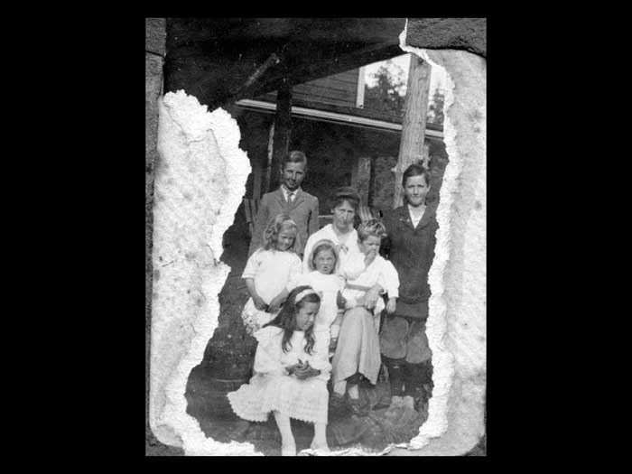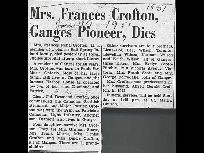 Oops, yes, okay. But that was in front of the harbor House Hotel, and I will go back okay, in front of the hot the House Hotel. This long high bank is there no longer because it was leveled by the enterprising firstborn son of the Prophet and family Dermott to create the famous tennis courts which you can see them and the swimming pool, which themselves are no longer there. The aerial close up view of the tennis courts and pool in the 1960s was taken by Marshall sharp. The swarms of clam diggers were not there on Wednesday, the fifth of September 1860 When Anglican bishop George Hills came visiting Saltspring Island, arriving by boat in Ganges harbour at dusk. Eager to meet any settlers before it became dark. He wrote in his diary, we pulled up the head of the harbor and walked up a winding trail through a deserted Indian village. That is the fifth of September 1860. What was then is an unoccupied village and Margaret shore Walter who is a child so the dwellings of the Aboriginal peoples living around her in the Gulf Islands, describe these buildings as long low community lodges. The photographs of long low community lodges in capturing Bishop Hills walked on through the village of long low community lodges to a log cabin. And he wrote in his diary that night, this was the house of Mr. Lineker. He could he continues his tale of visiting the early settlers of Saltspring. And all of this is on the archives on advertising the archives. It's absolutely wonderful. You can bury yourself there for months on it. Okay. But today we will focus on the location. The land preempted by Mr. Minica. Because this is the land which is now the location no longer have limit his cabin, but as the harbor House Hotel. The limit the family did not stay very long on the island. In the 1940s, Margaret shore Walter interviewed Dominica daughter, now grown up at Harbor house was chosen as the place to meet to learn about this property at the head of Ganges harbor. Margaret had a special interest. Mr. Linacre sold it to offer Walter, who is Margaret's husband. The land then passed from Mr. Walton to Mr. Scoville and then oops. And then from Mr. Scoville to Fred Crafton as written in times past, about the turn of the turn of the century school bell sold to Fred Croft and 100 acres of this land with the house which became known as harbor house, as Reverend Wilson recorded in his journal. Our daughter Nona married Alfred Gerald Crofton. Fred, we usually call him September the 17th 19 103. They have a farm of 100 acres, which Fred purchased from Mr JC Scoville that you Yeah before 1903 Is their wedding. This was before the Malcolm and Purvis store began in Ganges in 1905. The stores in 1907 became motes. So as this young couple living in their farmhouse begin to develop a farm and a family, so to his Ganges about to develop into a business center, the young Crofton family at their heart, where am I sorry, young Crofton family at their harbor house home had a clearer view of the growth of Ganges. This is a part of the story of the conception, but I'm not going to go into it. In 1937 Lindley crease drew this view from the harbor House grounds. As Margaret shore, Walter puts it, a wharf was built on the picturesque peninsula at the head of Ganges harbour, known to the Indians as seal and around this important landing place developed partly through the enterprise and energy of milk brothers, the island's largest business center, Ganges Margaret shore, Walter describes the view and the sounds from Harbor house where she was interviewing the woman who had been the little Linacre girl, that little Linacre girl taught by the Indians how to dig tans to help her survive, because the Linacre parents were inept settlers, and that's partly why they left. Margaret Travolta takes us right there to where she was interviewing the Linacre daughter on the grounds of the harbor House Hotel. In the 1940s. I was standing whether Linda home must have been looking down the harbor, quiet in the sunshine of a beautiful summer day. We stood near the covered veranda looking across fine tents long, sheltered by shade trees to the beach below. were groups of young people in bathing costumes, we're talking happily. So a place where people come to mingle the locals with those from off Island and far away. This was part of the ancestry of this place. First Nations would have done something much the same. Okay, so first, fast forward to 1916. And we're getting on to the birth of the Harper house. No, no, no. And Fred are producing children, one after the other. And the Crofton farm doesn't seem to be doing that. Well, Fred is in depth. The first world war has broken out. Of course, Fred has not been expected to sign up to fight in France. For a start, he's growing food. But he would also be leaving a wife alone with many young children, six by 1916 or under 18. And the youngest, not in this picture, was still a baby. The youngest stairs growing up by now, Fred is by the time that this photograph is taken. Fred has actually less because to alleviate the debt that he had got the family into. Fred does finally sign up. He leaves in 1916. I cannot imagine the conversations. The two of them were having to end up with that decision and how urgent it was for him to go and risk his life in order to pay off her debt. What is known to do she is resilience itself. Known have felt that friends of hers in Vancouver must be lonely just like her their husbands overseas, he asked them to come and visit. Soon a colony of tents sprouted on the property erected in May and taken down in September for year after year after year. After that. modest investments were placed in the colonist and in the province. But the reputation of harbor house actually grew by word of mouth mostly. The CPR brought visitors to the island and to their inquiries. Where can we stay? The answer was harbor house. Nona recruited her younger brother Norman to expand the family home into a beloved res