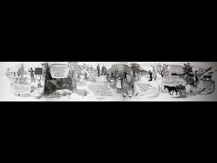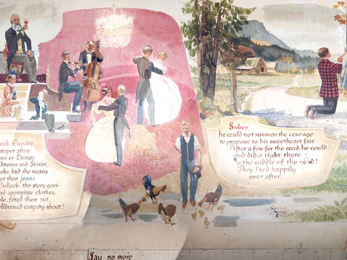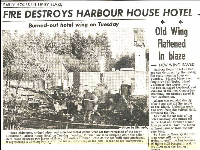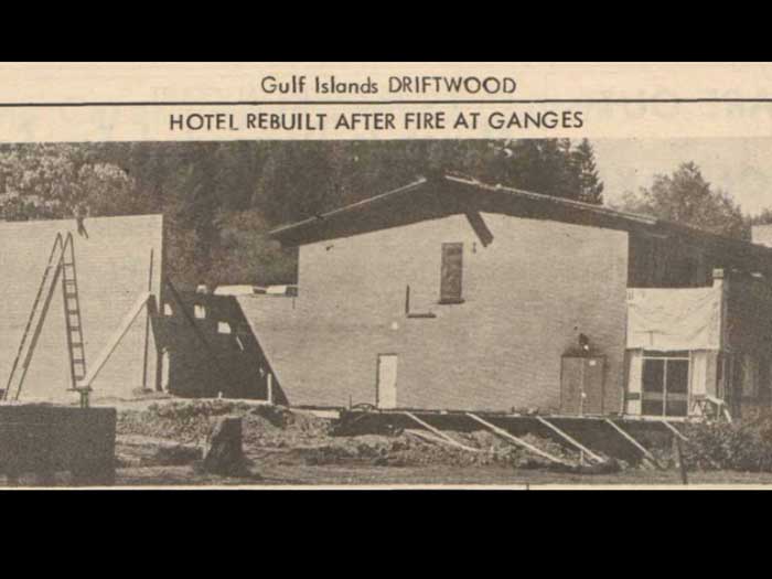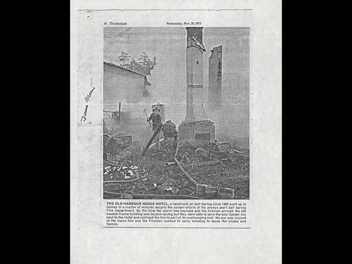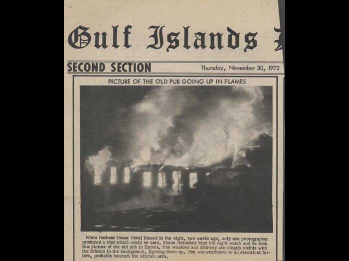 Thank you. in black and white photographs have been taken as a full mural freshly completed, completed in May of 1972 by Marshall shop. So I have I have no this set of them. There were more. Two more, we're now in the museum. And then we can see some outfits work in the private homes that are just stunning. He took the stories of B Hamilton to illustrate the history of Saltspring island so they're incredibly funny. And Alfred wrote poetry which is children's cringed doggerel. To Children cringy your poetry good. For children, I think it's was a bit a bit rough, because, of course he's his first name his mother tongues German. So His English is in his poetry, but I love this poetry. This can see all of it that each panel has a whole poem written by. Okay, that's not written down here. In November, yes in black and white photographs have been taken up the full mural freshly completed, that's may 1972. In November of that same year 1972 The old rustic harbor house burned to the ground. had built a heavy duty firewall between the old buildings and the new pub with accommodations above. You can see the new public accommodations about the newly built addition remained untouched. Firemen had their strong suspicions. Alpha temple believes the fire was deliberately set for the insurance, he was not alone. It must also be said that the old wooden building had had it stained and was due for demolition. gotta hurt Salk had already told everybody when he first came here that the final stage of his improvements to the harbor house would be to the disappearance of the old wooden building. So this was a bit sooner than they expected. But perhaps plan went ahead