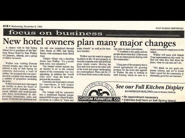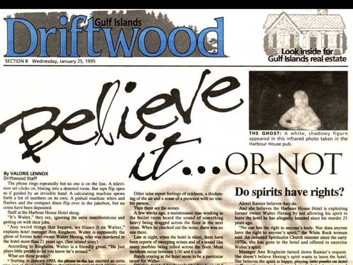 rising from the fire, hotel rebuilt after fire at Ganges 10 months later, September 1973. Mr. headstock was murdered. If you want to know the grisly details of the mayhem and murder, find this account in the archives. Shades of a colorful past by Helena Davidson, writing for an off Island audience, which does so love to hear. That's crazy. Saltspring Island is reporting the mayhem and murder of Walter Hertzog. This report emphasizes secrets and the mystery and surmises, Hertzog wanted the hotel to be a swift resort for well heeled tourists. This meant getting rid of riffraff and they did not like that one bit. Someone took it upon himself to do the dirty deed, or get someone else to. For now, I'll just say that a man died. A woman was widowed, and a young Saltzman Islander, went to jail for nine years. What followed was reporters writing about a ghost. You can see the ghost in the photograph, a white shadowy figure appeared in this infrared photograph taken at the hopper house. This has been great fun for Islanders and often this. For many years, ghost is presumed to be that of Walter Hertzog and all the fun of him in the sky. He disturbs band members and cleaners and out in the community, will you you will hear remarks like I used to be the head housekeeper at the harbor house in the early 1990s. And yes, Walters spirit was around a lot. Again, if you want to know all the spooky spooky details, or the basis of the interest of foreign professional spiritualists specializing in exorcism, this local driftwood account in the archives is solid. It includes the fun of the inexplicable ghostly pranks, lots of electricity and and serious discussion from a spiritual point of view, believe it or not, isn't. Back to the murals? How can murals be lost? I'm just going to check what the next showing you are. Yes. So it's got so much in this article. The apple of His eye is saying that headstock had said that this project as a harbor House Hotel, the hotel was the apple of his eye, he just loved doing this. And so it was surmised that when he died, he couldn't leave. And also he sort of took the life out of everybody. Afterwards, he was having all the fun instead of murdered man's ghost place plank in hotel, in hotel. So that's all the reports of the oddities that occurred. Okay, so, back to the murals. How can you be lost? After told me walls always get pulled down or painted Denver as a new realist, he was used to it. He was amazed at how islanders responded to the loss. Louise Woodward, a painter who had studied what the walls while her husband and their friends drank and smoked in the pub told me that when they were ruined, she went home and wept. What happened? Well, for nearly 20 years after the murals first went up on the walls from 1973 to 1992, a series of new owners came and went. Sometimes new owners connected with community groups to understand the island way of life, that however in the end, they usually develop their plans based on what was best for them. essence. Someone recently wrote an interesting piece about why Saltspring Island is wary of newcomers. Island this recall when the new owners purchased the islands historical landmark harbor House Hotel in the early 1990s. Their plans included major changes to the hotels path, a place that brought together hippies, loggers, pioneer families, and the motorbike crew. The pub also housed two walls of murals depicting the history of Saltspring Island and providing a great source of pride in the community. During the renovations, the murals were covered and destroyed, the community was upgraded. To the locals, the harbor house had had a history of feeling like it belonged to them, was there for them. That new pub risen from the ashes of the old hotel with its murals of old mayhem and eccentricity and become known to locals as the horrible house, they felt it was theirs. Sometimes when the hotel became a bit worn or disreputable new owners would feel happy with their investment having made such changes. Some locals might well appreciate the upgrade. Some might miss the familiar. The hotel was not always a total success. sign tells the story or doesn't. Like the Phoenix, it maintains a history of rising again. I will have to leave out the 21st century developments because it's time for that. We will end with fun and laughter revisiting the horrible house years of the 70s and 80s then Jason will read to us his Ballad of harbor house. It's good to have you with us. It says it's good to have you with us. And I love whoever