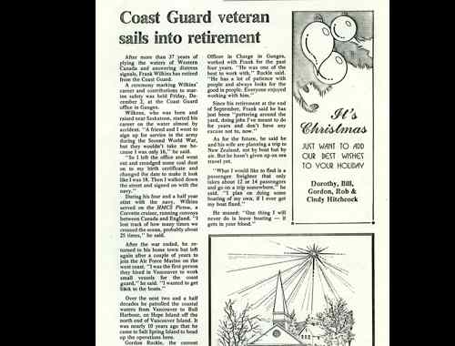 its own vessel and the Coast Guard and I don't know just how we ended up with it. And I imagine there was there was some there's a political story here somewhere but we ended up with a yacht that had been in the Bahamas that some guy back in Montreal loaned and, and he wanted to sell it and he had a friend that was a knob in Ottawa anyway, the government bought this yacht. And they sent it out here to be the new Coast Guard boat. It wasn't a bad vessel, but it was a little too Yachty and not enough cutlery, you know. So we looked at this thing, and we basically cut the top off it and had a new wheelhouse, designed and installed on this thing for our equipment in the handles the job at hand a little better. This lesson was called the 122. And unfortunately, I don't have a picture of it. But it was the first it came here to the station with Frank Wilkins and chap named Fred Moxie. And they, there was another guy named Philips. He wasn't here very long with a poor chap had a stroke and he was only about 22. And so he left the Coast Guard. Glad to say he made a great recovery and he's all Keynes these days. Might it might tell us anyway, the postcode arrived here with Frank Wilkins, Fred Moxie, Norm Anderson, and then they hired some fellas here, who we will know this day is getting Carl's who is the current OYC down at the station, and heard John Wilcox. Tom Burlison. Gotti Rachael and Tom Shelby was working as a casual here at the station. The 122 and they Oh, there the station was set up down at Centennial Park, right to right by where the kids had the little playground there, you know, and where the bathrooms are, there was a trailer there. And they kept the 122 down, right at the foot of the ramp. She was about in the 42 foot range with the twin, I think they had cats in her 30 toy cats. And she would do about those 15 or 16 knots. And it worked out pretty good. Until one they didn't have a very good radar aboard and Frank had had requested this, this is news that I just got today. From Fred Mach. She sent me this today, Frank had sent or been putting in for this new radar. And then he went away on vacation leaving the station and then Fred marks his hands. And Fred the the this new radar was going to be considerably bigger, bigger antenna and it would be way better, Reagan cetera. So there was some current concerns about the weight of this thing. So they they they they did some stability tests on the boat and the green architects crunched the numbers and, and word came back to Fred that he wasn't to take this boat out in any wind more than 20 knots. Well, that's a heck of a Coast Guard Cutter. They were very there was a lot of concerns that it could tip over. So this was