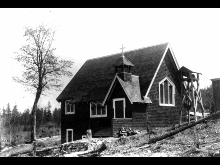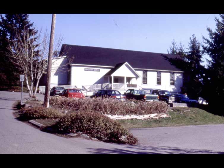 And Grace Point square has not opened up yet. And I guess this is an older one because that hasn't been filled in yet. This has become a historical thing. The boardwalk construction. It started about 18-, I'm sorry 1960, 1979 I think it was. Just let me check, think I've got a date here. 1989, it basically started. Okay, now I'll start going into some of the buildings. That's more or less what you'll see today, Harbour House Hotel. And it's had a lot of changes over the years. That's pretty well how it started out with the Crofton residents, Fred Crofton and his family, it goes back to roughly about 1903. And this had many changes in the meantime. That's after one of the first editions that took place. And here's a later one showing the tennis courts and later on, there's a swimming pool. And those tennis courts were well used. I'll just refer to my notes by saying that the courts, red play tennis courts, they're built to Canadian championship standards. There were annual tournaments, where players came from all over, Vancouver and Victoria, and Seattle. And Canada's number one ranked men's player played there. As did the USA's number two ranked player. One woman even went on to play in the Wimbledon. Some have commented that these were the best courts they had ever played on. Harbour House Hotel was also the scene of a murder, a manager there. Mr. Herzog was murdered in 1973. The hotel burned down in 1972 and it's gone through many changes in the meantime. Moving along, we're looking at the old buildings more or less in order as we come along Lower Ganges Road, then we'll go down Rainbow Road, Hereford, McPhillips. Sort of take a route, a walking route. This is All Saints Church as you see it today, which was moved from across the road. St. George's church, it has moved over physically, and it's substantially added on to. And that was a new church that replaced the original Anglican church that was in Ganges, that was built in 1911, when it burnt. And then it burnt down in 1936, or 1938. And that's when St. George's church was built. That's located at the corner of Dean Road and Fulford-Ganges road. There's nothing there, well, there's nothing of interest on the site itself now. But that's where it was, to put it into context. Mahon Hall in the fairgrounds, the Farmers Institute bought land from Frank Scott in 1901. They had their first event there, which was the Fall Fair in 1901. They had had them here prior to that, after the Hall was built here in 1996. That is as it is now pretty well. That may have been the official opening of Mahon Hall in 1902. If it wasn't the official opening it was right about that time. And it's been added on to substantially since, the next version.