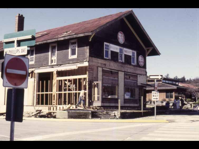I mentioned where the House Piccolo now is, that was a telephone exchange was built originally by Mr. Bullock for the assessor at that time, who didn't think the assessor should have to climb up stairs. So he built the one story building for the assessor. That later became the telephone exchange. Okay, down to the trading company. That's the trading company there, that's McPhillips Avenue, that became McPhillips Avenue. Recognizable, I hope, as the trading company. Here it is, pretty well as it is today. This is shortly after it opened. Salt Spring Island Trading Company. This is the later version after the gas tank was added, gas pump was added. Some alterations that were taking place, red and white stores that time. This is Stan Wagg, who was manager for many years, decades actually. The rolling ladders where in those days, you didn't pick up your groceries (unintelligible), you went up to the counter, went through your list, and the clerk would go back and get them and bring them to the counter, and you paid. Or put them on credit. That is what is now the Cora Inn. That's an early version of it. This is an even earlier version, before... Actually, I should go back to the beginning, it was built by Oldie Garner largely in 1927, 1928. He never occupied the building. He occupied it. He lived in a little one story portion at the rear. But it was later bought by the Henn family in the 1930s. And they had three daughters and two sons, who called it the Henn House, because of the three daughters. Anyway, after the Henns bought it, they added the new movie theater. I don't know how many of you went to theaters such as this, but Tom is one, where they started off with a cartoon. And then they had the (unintelligible) news. Preview of next week's movie, then the main movie, which was often served from one week to the next. The movies were held on Friday evening, Saturday evenings and matinees on Saturdays.