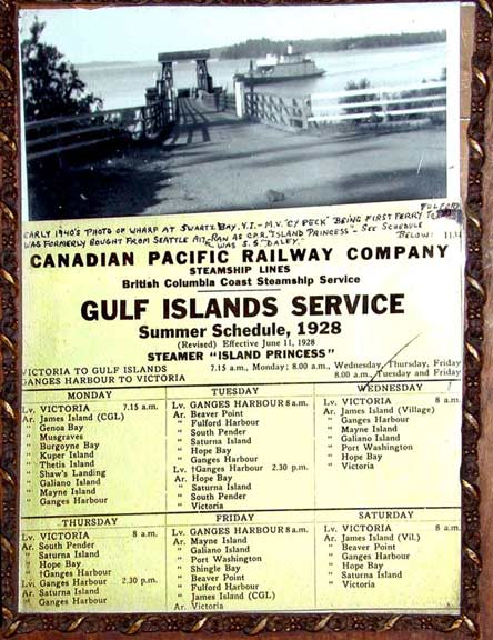 The CPR boat did stop on Saturna Island, attached is the schedule from 1928, although in the 50’s it might have been the "MV Lady Rose”. It stopped at Lyall Harbour. |