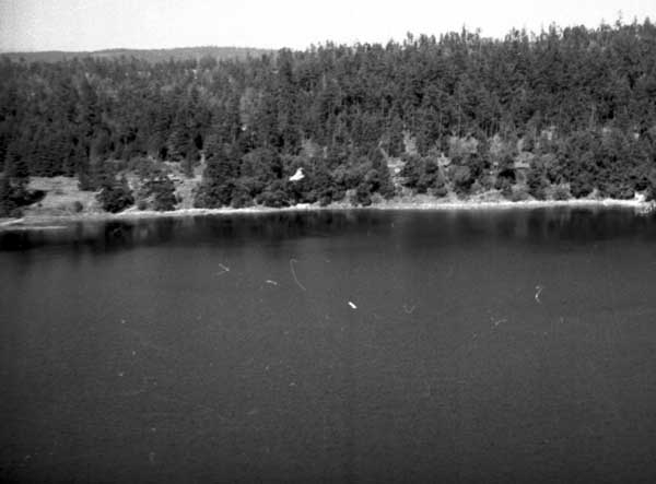 Resort at 1136 North End Road (currently Cedar Beach Resort) on the right. Resort at 1170 North End Road (currently St. Mary Lake Resort) and its boathouse in the centre