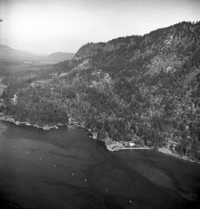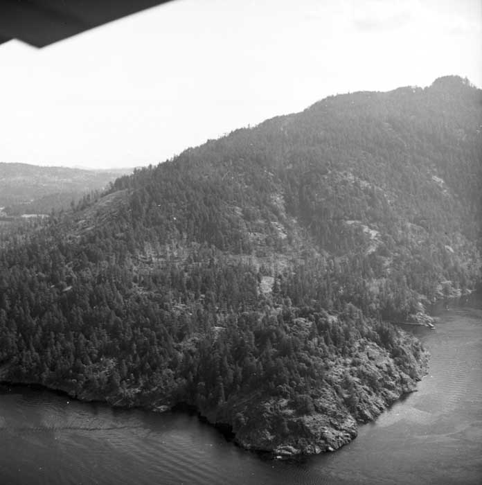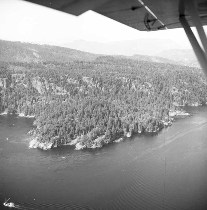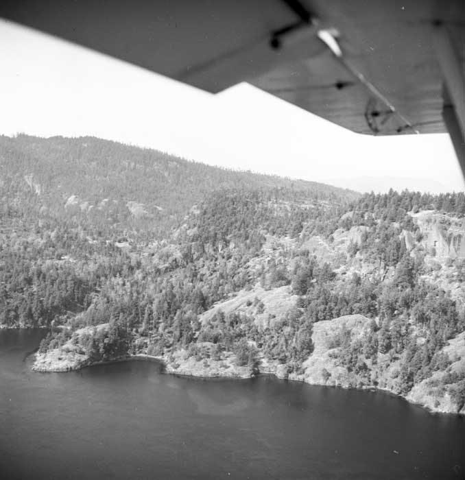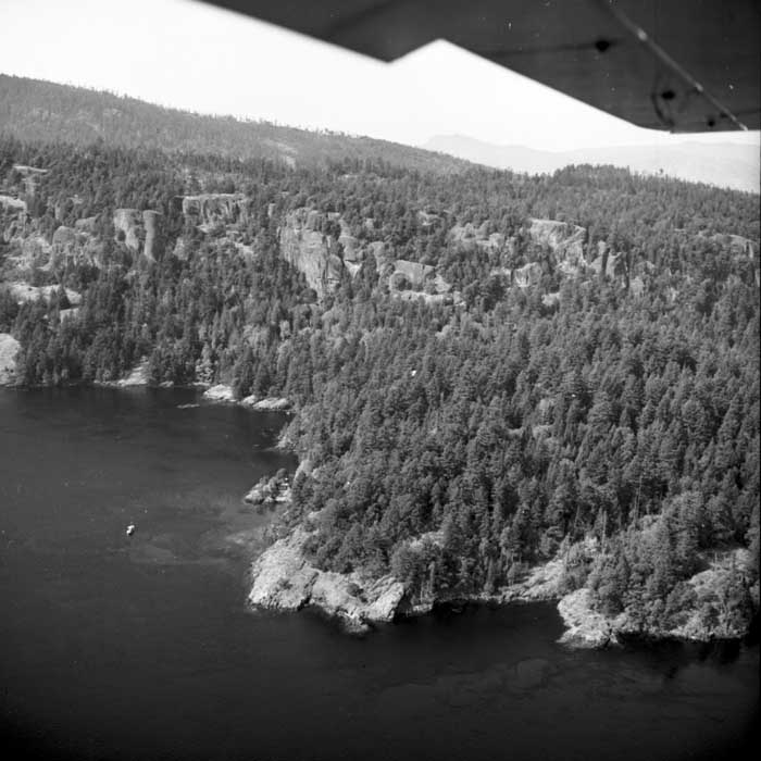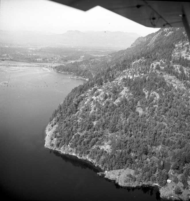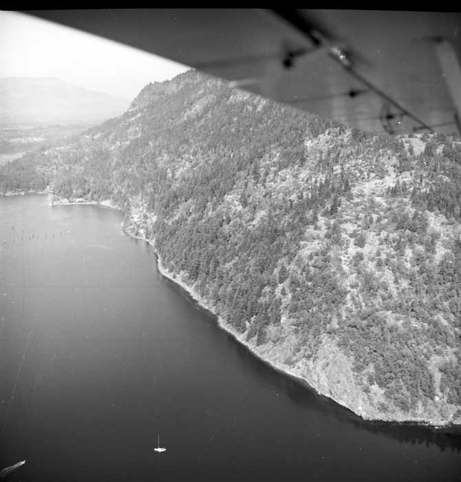 Bold Bluff at entrance to Burgoyne Bay from Sansum Narrows (Vancouver Island bottom left), Mount Maxwell top right