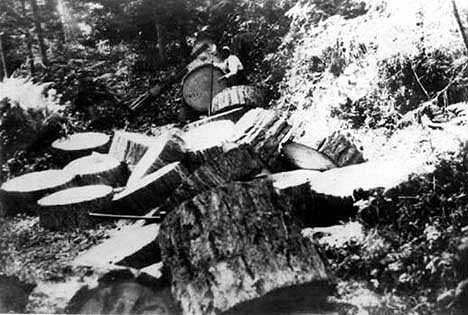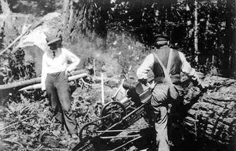 Joe Nightingale and Jim Horel (R) on springboards, falling a tree on Mr Collin’s property.