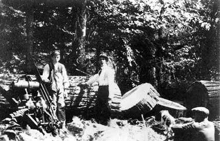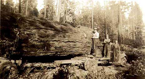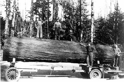 Mike Lumovitch, Bill Morgeson, Walter Jameski stand atop a chunk from a forest giant.