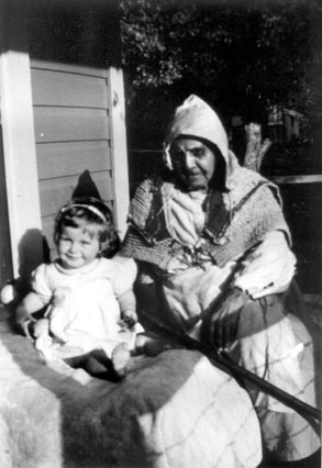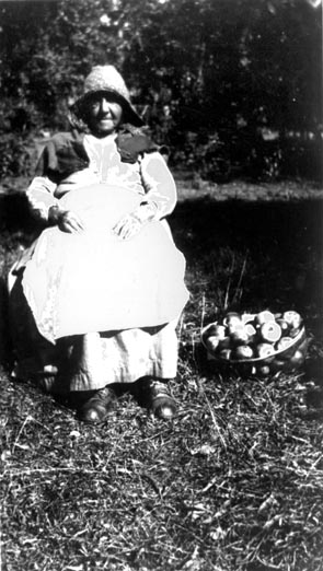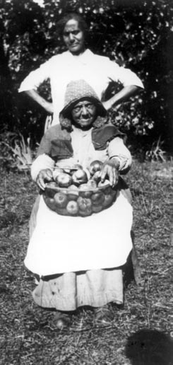 Sylvia Stark holding a basket of apples, with her daughter Marie Wallace