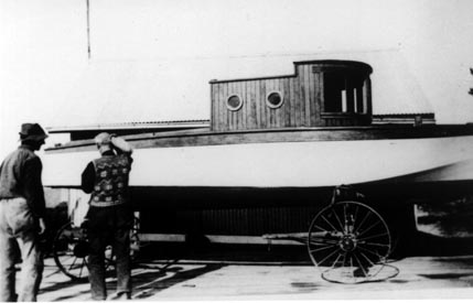 Alfred Ruckle and Daniel Henry Ruckle (Henry Jr) wonder how to get the boat into the water without losing the trailer!