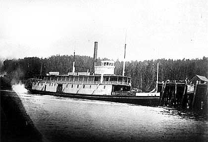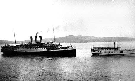SS Island Princess disabled and being towed out of Beaver Point dock by SS Princess Victoria or into Beaver Point for engine repairs, depending on who told the story
