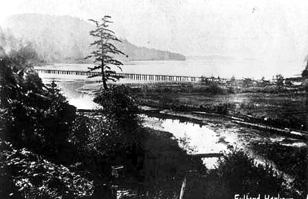 Very early. Bridge from St Paul's Roman Catholic Church to junction of Fulford-Ganges Road and Isabella Point Road. Fulford Creek in foreground
