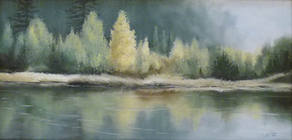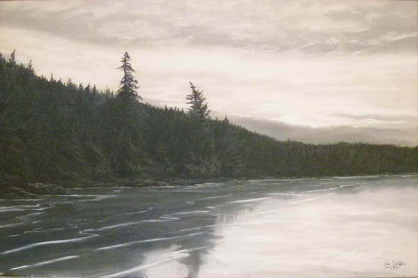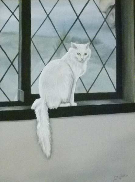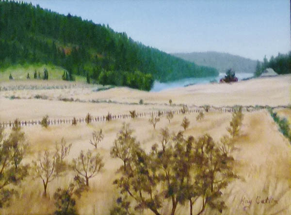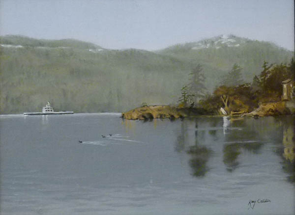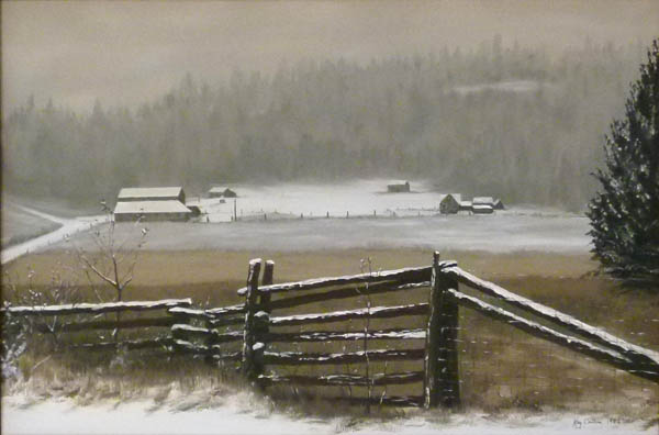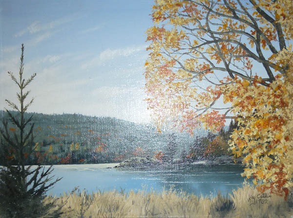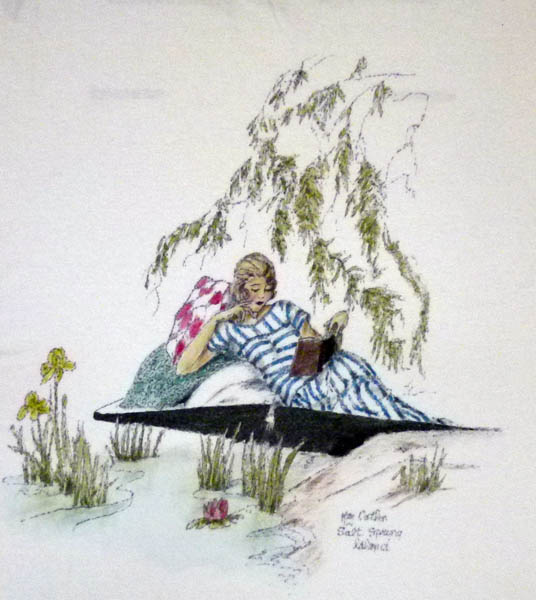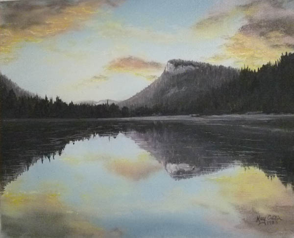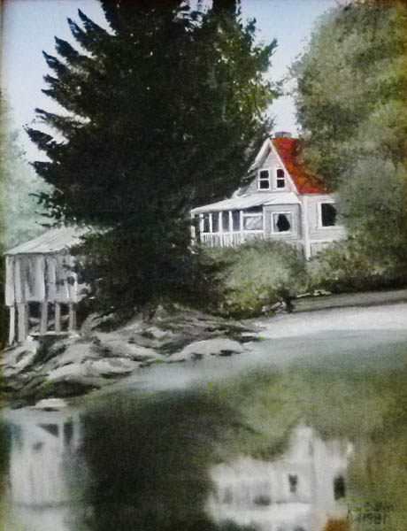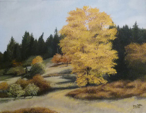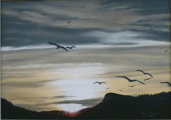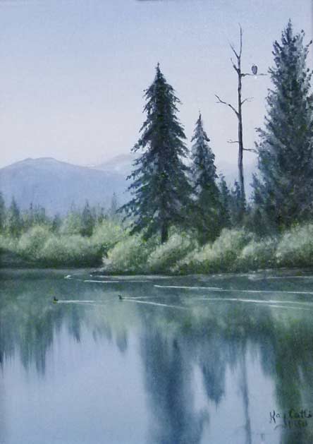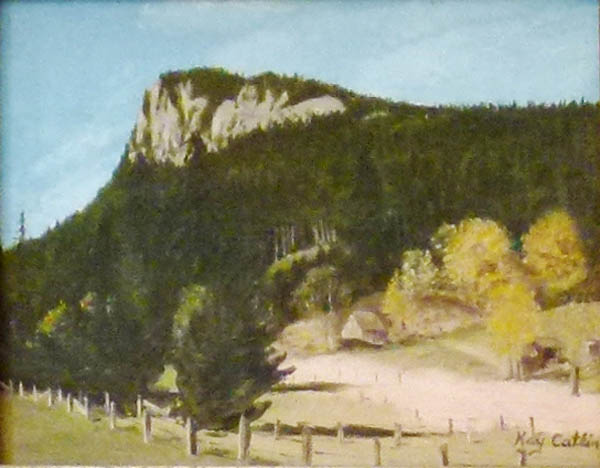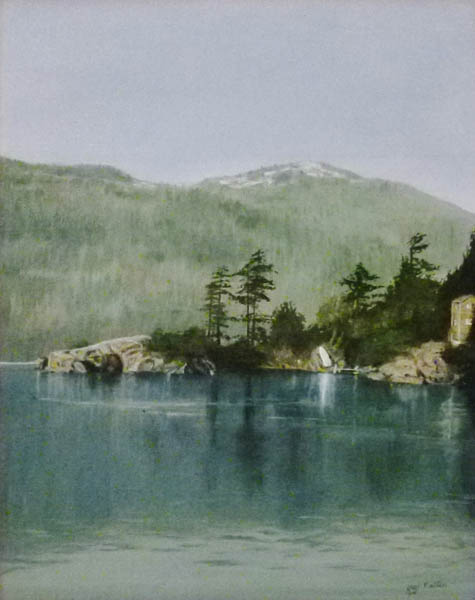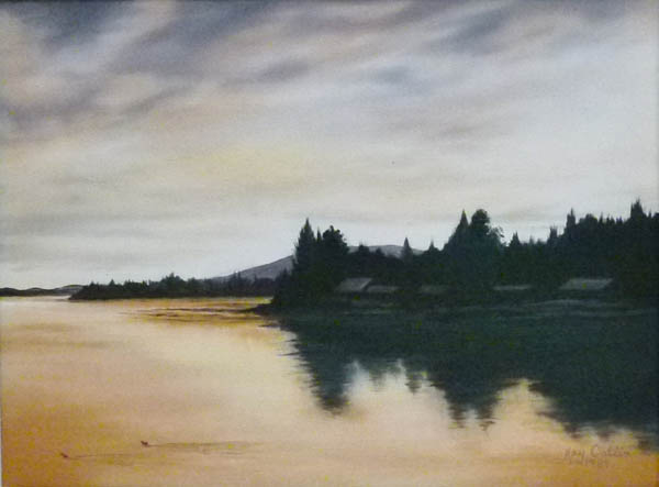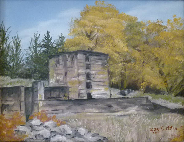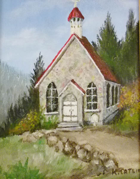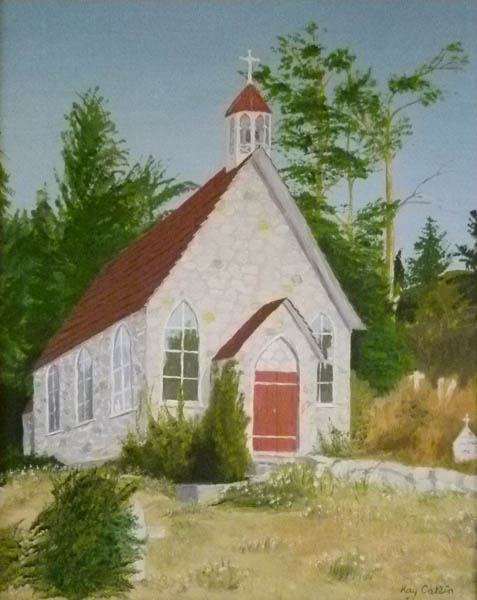 And anybody who lives that Fulford knows that cave was the official Fulford parking police. And if you ever had a run in with the parking police, it wasn't easy. She was determined that people were not going to park where they weren't supposed to. And she made little things to slip under your windshield. And she used to get after the tourists something terrible because they insisted on parking in front of the old gas pump in front of the old Patterson store. She wasn't having that. So she went for coffee every morning at the cafe with Brian Rowley and I don't remember who else used to sit at that table. David MC, yes. Right. And then she went out and harassed all the tourists with her parking police policies. We need to now we need her now. You ever St. Mary's Church and how have a look at your headstone. It's just about halfway up on the left. And after all of the wonderful ideas that she translated into fabric and Canvas and painted, Kay developed dementia. And it was really horrible for all of us who knew her and loved her and all her eccentricities. And eventually, all of her children lived in Australia, it was a very difficult time for everybody. And finally, Kay went to Greenwood. And she had several extremely sad falls and got several golf fractures. And it was a very untidy end for an extremely talented person. So too bad. Life is odd. So have a look at all the wonderful paintings, we've got a beautiful collection of canvases, in all kinds of styles. Even she, she tried acrylic, and I do have one example of the acrylic. She did photography, and I do have to have her nice photographs framed. You didn't think I was gonna let Terry do all the talk. No. Kerry's giving you a great background on I just wanted to point out a couple of things. As you go into the other room, there's a list there with the names of the paintings and the people who donated them for our use for this art show. So I'd welcome you to pick up one of those as well to browse the different items. We have a number of packages of case cards that she produced. I don't know if it was a slip of whatever. But if you want to have package of cards, you're welcome for a donation of $2 to have a package, but be forewarned that each package contains two cards and two envelopes. We don't know we're not going there. But the card