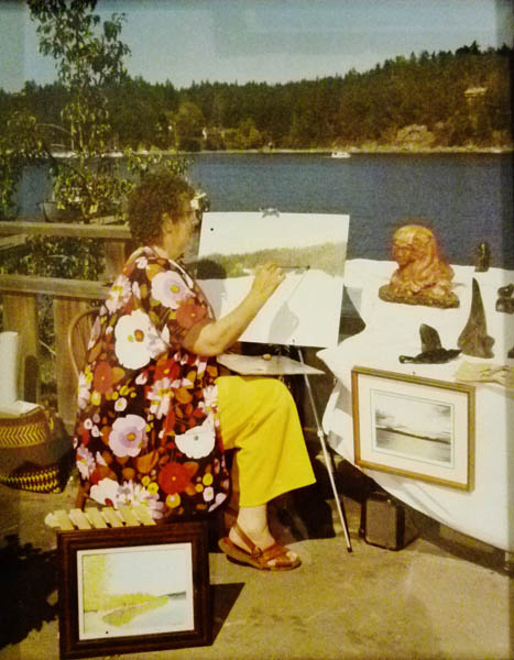 Yes, yeah. Is there anybody in here who does not know, Kaplan, is that possible? If you're a corporate uncertain okay. For those of you who maybe don't know, leave Hill is named after my great grandfather. And a case Father Ted was Ted Lee. And he was the son of the people who established the farms on the hill. So Kay was born April 22 1924. She was the oldest child at TED Lee, and Phyllis James. And I don't know if any of you know the James Seed Company. She was a seed company, James. And she was followed five years later by twin sisters, which almost killed her mother, Gladys and Francis. Francis and Kay, both grew to over six feet. Gladys was about I don't know, four foot 11 No, she was a little taller than that, but maybe five foot one or two. And when Francis and Kay were so in their, in their 30s, they may have had to make all their own clothing because there was absolutely nothing for a woman who was over six feet tall, and they may see oughtest clothes, you have everything. And when the two of them were walking down the street in Vancouver, it was like Moses parting the Red Sea. People would literally park like this and turn to watch because they really did look like their Viking ancestors. Francis actually, they are all buried over here in the church. Kay and her husband George, her sister, Frances, her mother, and they are very about halfway off the main road on the left with the LEA grandparents. So Gladys married a Maxwell and they lived at footprint for a while Kay and George got married in 1948. And they lived in Vancouver where their children daughters, Sean and twin boys, Mike and Pat were born and raised. And they had a very traditional marriage, sort of George wet work and Kate sent the money. And no, she was an extremely busy person. And she was artistic in in every sense of the word. And anything she saw that she hadn't tried, she had to do, and you would not believe some of the things. I remember her son Mike had scoliosis, and when he was in his late teens, they put two steel rods in his back and he had to be lined down for a long period of time. And Kay nursed him But Michael for some reason rather wanted his room painted black. So she painted his room black, and she made him the most enormous light fixture I've ever seen. It was about this big across. It was white in the in this little bedroom, this black bedroom, and it was made up of all things, styrofoam coffee cups, and it made an enormous ball. And when the light went off in the center of that, all the bottoms of those cups all glued. If she made her living room carpet, I would have carpet samples which she went around to the carpet places and gathered and then put together with duct tape she was they were are a very generous people when all my cousins and I from Salt Spring all moved to Vancouver, two of my cousins were looking for an apartment in case at night you can come and live here until you find what you want. So now they're with twin boys and teen, teenage daughter and my two cousins, and K and George and it was then my brother decided to move to Vancouver. So she Kirtland off part of the basement and put a light in there and a bed and that was kids bedroom. And it was just a really loud, raucous, incredible household. When Katie decided that she and Frances were going to go to Hawaii, they had no money for such a thing as the air fares and nevermind stay in a place that coypu so she took up bread baking and it was not unusual for Kay to bake 16 loaves of bread or 20 loaves of bread in a day. And the next morning, she would put that ball in basket and she had a regular route of places houses that she went to. And she thought bread and any anytime it snowed, she's no shoveled, she shoveled people's walkways, and driveways until she had enough money to go to Hawaii with brown. Did that for years. So she, her art was she did everything. Absolutely everything. And as you walk around this afternoon, you'll see examples of her oil painting and her ceramics. Her fabric painting. I do have two samples of that. I'm amazed that we got those because she did those probably back in the 80s. But I did find two T shirts. She made life size dogs out of mink coats, which she got at thrift shops and those days you could get mink coats and muskrat coats and she cut it all sewed it all stuffed it all. And when I very proudly got my main dog. It was like a Pomeranian and I was walking down town in Ganges the day that I picked it up. And I have this thing stuck under my arm. And you can't believe how many people pet it. My main dog. She not only painted but she drew and she sculpted she quilted. I remember two quilts distinctly that she made when she was living at Fulford they had black background and I couldn't find any I'm sorry, I did try because they were such amazing things. And if you're quilters, you'll understand the amount of work that went into this to that I remember one was a daily a quilt. The balloons were about this size. But every pedal was individually sewn and stuffed and applied to the quilt. So they were a three dimensional and I remember her doing one in dailies and one in chrysanthemum every petal sewn and stuffed and apply. They were absolutely amazing. I had never seen anything like them before. I never have since there's just so much work involved in it. But I think she thought them all and probably didn't get nearly enough money. But she sewed she knitted she crocheted. She just did everything because as she said she was so very easily bored. And after doing one of those daily quilts if she did two more, so probably the bored with it and moved on. So there might only be those two, who knows. And that was the same with her knitting she needed incredible sweater. And then she got bored because she had mentored herself out she's done everything she wanted to do with knitting needles. So they moved back to Salt Spring in the 70s. After George retired, he worked for the city of Vancouver Cooper, and w