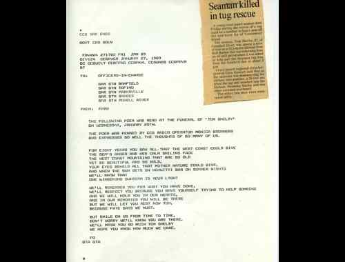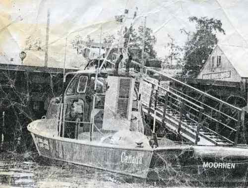 its own vessel and the Coast Guard and I don't know just how we ended up with it. And I imagine there was there was some there's a political story here somewhere but we ended up with a yacht that had been in the Bahamas that some guy back in Montreal loaned and, and he wanted to sell it and he had a friend that was a knob in Ottawa anyway, the government bought this yacht. And they sent it out here to be the new Coast Guard boat. It wasn't a bad vessel, but it was a little too Yachty and not enough cutlery, you know. So we looked at this thing, and we basically cut the top off it and had a new wheelhouse, designed and installed on this thing for our equipment in the handles the job at hand a little better. This lesson was called the 122. And unfortunately, I don't have a picture of it. But it was the first it came here to the station with Frank Wilkins and chap named Fred Moxie. And they, there was another guy named Philips. He wasn't here very long with a poor chap had a stroke and he was only about 22. And so he left the Coast Guard. Glad to say he made a great recovery and he's all Keynes these days. Might it might tell us anyway, the postcode arrived here with Frank Wilkins, Fred Moxie, Norm Anderson, and then they hired some fellas here, who we will know this day is getting Carl's who is the current OYC down at the station, and heard John Wilcox. Tom Burlison. Gotti Rachael and Tom Shelby was working as a casual here at the station. The 122 and they Oh, there the station was set up down at Centennial Park, right to right by where the kids had the little playground there, you know, and where the bathrooms are, there was a trailer there. And they kept the 122 down, right at the foot of the ramp. She was about in the 42 foot range with the twin, I think they had cats in her 30 toy cats. And she would do about those 15 or 16 knots. And it worked out pretty good. Until one they didn't have a very good radar aboard and Frank had had requested this, this is news that I just got today. From Fred Mach. She sent me this today, Frank had sent or been putting in for this new radar. And then he went away on vacation leaving the station and then Fred marks his hands. And Fred the the this new radar was going to be considerably bigger, bigger antenna and it would be way better, Reagan cetera. So there was some current concerns about the weight of this thing. So they they they they did some stability tests on the boat and the green architects crunched the numbers and, and word came back to Fred that he wasn't to take this boat out in any wind more than 20 knots. Well, that's a heck of a Coast Guard Cutter. They were very there was a lot of concerns that it could tip over. So this was