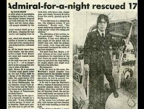 consistently Roland Campbell, who now is full time co starred. And another chap called the payment natural payment was a refugee from Iran, who his specialty was really first aid payment was a great first first aid man, great medical man. And he to this day is he's not in the Coast Guard now but he's he's with BC ambulance imagine he's doing a great job. So anyways, we're heading up a trip to Maui. And we don't know, we haven't been taught very much. And we just have vision to this thing is on fire. And you know, you are a 40 foot 41 foot boat, and you're gonna go deal with this deep sea ship and just so it's sort of like, you know, you're gonna go on stage and you get a little bit of stage fright. Because how are you going to do this and you're trying to decide and kind of make a plan. And of course the boys there they're all a little twisty Twitch, too, because they're, they're gonna be the ones on the pointy end of this deck. And I remember rollin turned to me and and at one point when we got up there, we were getting pretty close. And I said, Okay, roll and go get your get ready. Bring in a sticky alongside the sand. Yep, there. He says. Davey says, I gotta tell you, he says, You know, I just had my basic firefighting, he says, and I don't feel very confident in tackling this thing. And I said, I said rolling by said you got to listen to me very carefully, you're not being put on that ship to fight the fire. You're going on that ship to find out what the situation is, and what we need to fight the fire. And what we can do to help those those guys, you know, find go find the chief engineer, the first mate or the master any one of those three people and start talking to him and give me some feedback and find out I need to know what the situation is. So lowly heads up there with the with the radio and starts filling me in. But you know, it worked out to be a pretty major incident and we ended up having the Big Air Force Labrador helicopter sitting on the bottom of the ship in case of to be an ambulance. We had the two hovercrafts I had the queen of newest minster steamed up Kamali, right up north of Davis Cooper Island, I have three deep sea tubs. I have a number of smaller tubs I had 20 firefighters from from Cooper and North oyster right, just above the yellow point there. They just weren't there yet. And fortunately, for us all, we had the Harbormaster and the MIMO had been following our radio traffic. And he took it upon himself to contact an IMO Fire Department. And they put together a team of really top notch firefighters guys that have been trained to penetrate big buildings and this sort of thing. And he came down with about eight of these top notch guys to have on the harbour Master's boat, which we are really out of the nine Mo's area and he came down and gave me a call when he got quite close and was glad to see them because you got to understand that the the firefighters that we had were all volunteers and who had been trained to to fight house fires and largely trained to get the people out and if you cannot the fire down fine, but the main thing is to get the people out but we're sitting here with this deep sea ship that's starting to really light up. And those guys the Nanaimo Fire Department saved the day for for us all really. And at the end of the day. They got the fire out, and then they had to take off and then the volunteers went in and cool things down. It got pretty hot in there one whole deck about ship was burnt out with a deck saw above all warping and starting to light up in the next deck up because the steel plates start getting so hot, but the fire got out and nobody got injured. And I was kind of glad to write that report. GRCC make sure that guy got the report about how the boat was gonna get tasked if anything major happened. Carried out so that was sort of a good one I felt I felt. Another one that I like to talk about is Bob Lord, and you might have heard about Bob. Bob Lord. He fell off BC ferry going through active paths. It was in the fall, we had been having real nice warm days and cool nights. Anyway, Bob had been with a picnic with his family in the Sydney area and then he had to travel over to the mainland and he had been stung all day. And I guess he got He figures he got a bit of sunstroke or something. But anyway, he got on the ferry. And he was down in his vehicle, a little pickup truck. He wasn't feeling very good. Then he got sick. And then he he wanted to. He didn't want to get sick on the ship. And so he went to the stern of the ship and leaned over to try to throw up off the side of the ship and he fell over. This is 11 o'clock at night and he comes to the surface and there's the ferry steaming away. Nobody's seen him. Then we came to a real glitch. The third gets over to to Swanson and off loads and there's this little truck down on the car deck. Where's the driver? Well, then the ferry reported the the this is a missing person to the RCMP who felt that he went home with somebody else or something i this part really boggles me but anyway, but nobody ever called the rescue center. And I don't know who finally called the rescue center but finally somebody called the rescue center and decided this is a marine problem. Because my phone rang at five in the morning and they said we think we've lost somebody off of BC Ferries and I'm going to BC Ferries running at five in the morning what time The ferry sale. Well the ferry was the last boat out of out of Victoria at 11 o'clock. Well, what am I getting the call for now? I mean, because as far as I was concerned, I was just looking for dead men now. And anyway, off we went and the hovercraft, they decided that they would, they would cover from Slauson to active paths, and we would do active paths to Swartz Bay. Well, in my mind's eye, if this guy is still in the water, he's, he's, he's gone. But he might have been able to swim ashore. So really, I want to focus on the shorelines of all the isla
