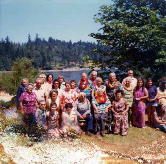 front: Frank and Mary Brown, Josaphine Ekawa, Paul Roland, Stan Harris and ? (Stan’s daughter) Taken at Roland house, Isabella Point Road