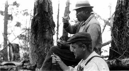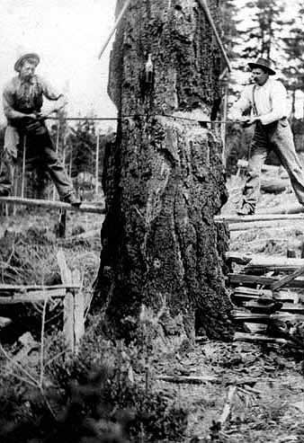 Joe Nightingale and Jim Horel (R) on springboards, falling a tree on Mr Collin’s property.