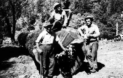 Mike Lumovitch, Bill Morgeson, Walter Jameski stand atop a chunk from a forest giant.