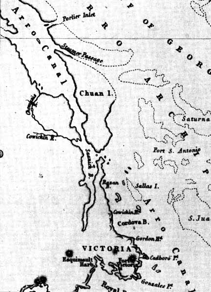Make an overhead of an early map of Salt Spring, made by Gov. Douglas on a canoe trip in 1852, Chuan Is. Discuss these questions with the class: